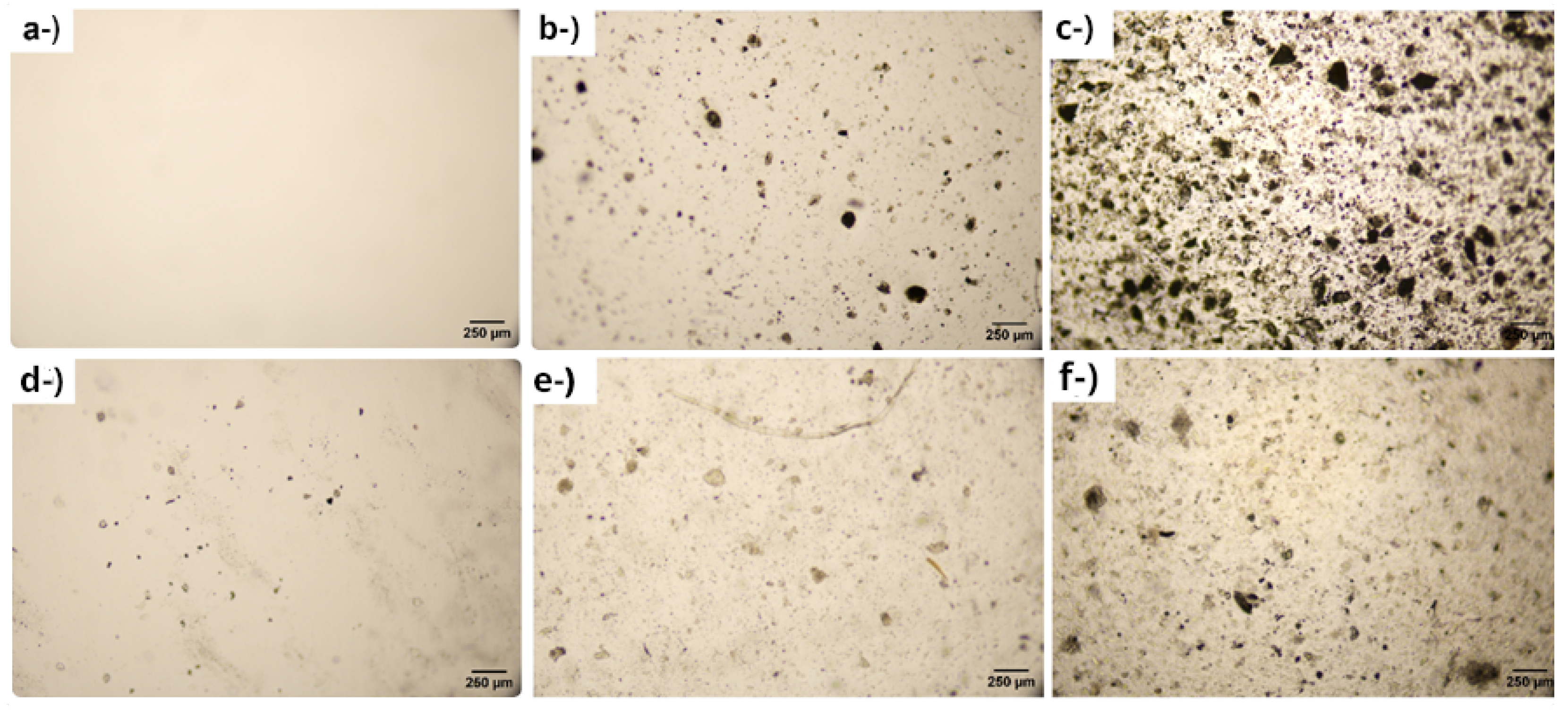 Digital optical microscopy was used to evaluate surface morphology and the dispersion state of the filler within the films. Micrographs were acquired using an Opticam 0500R (Opticom, Doral, FL, USA) optical microscope at 10× magnification, with image capture and processing performed in TCapture software v5.1. Images were recorded both with and without enhanced light-contrast settings to improve the visualization of surface features and particle domains. The micrographs include a 250 µm scale bar for calibration.
