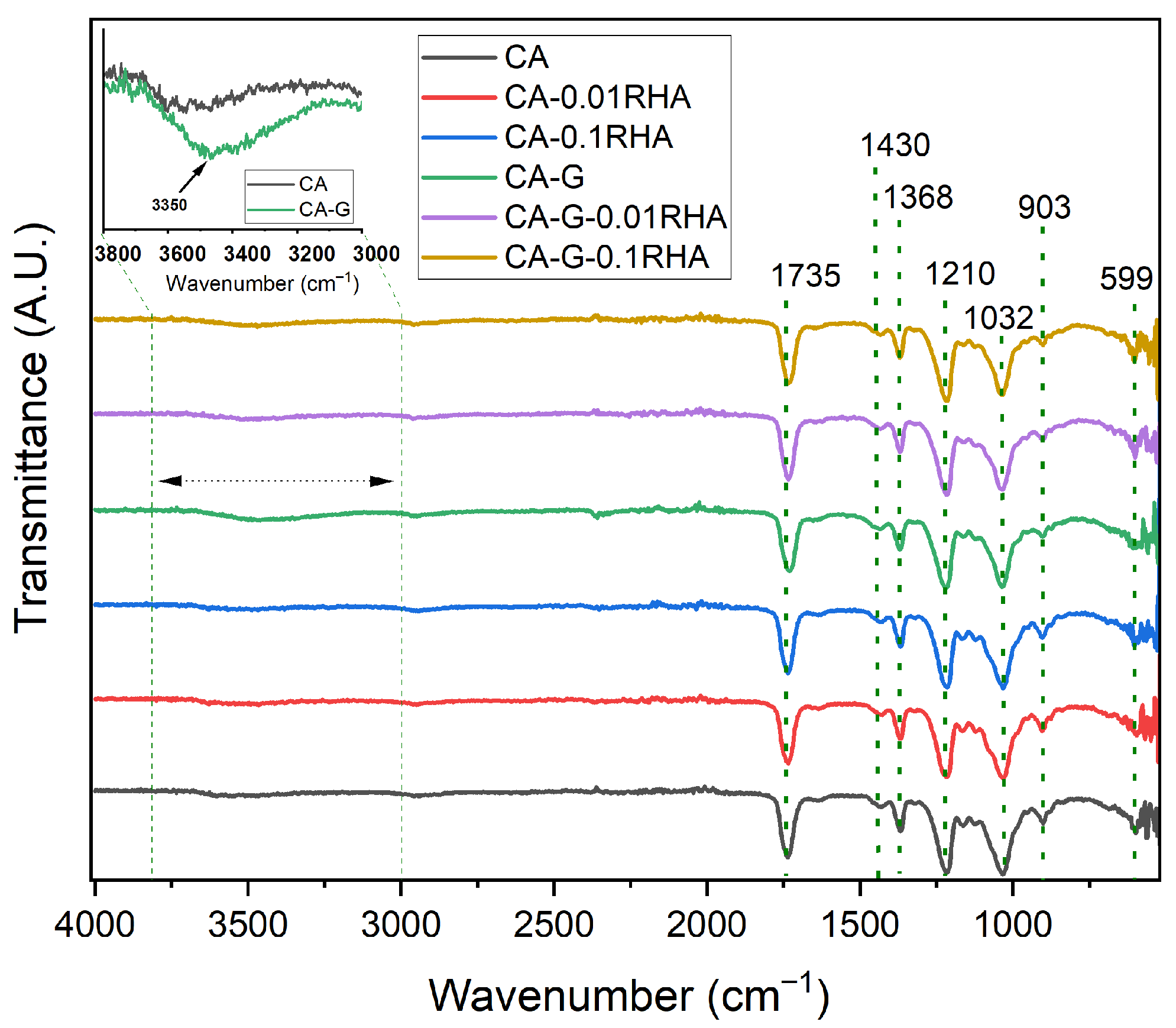 Incorporation of silica-rich RHA markedly decreases transmittance across the entire measured range, consistent with enhanced scattering and absorption from inorganic domains. At low RHA loading, CA-0.01RHA and CA-G-0.01RHA converge to similar visible transmittance values at 633 nm (36.85% and 37.04%, respectively), while their 400 nm transmittance remains lower (31.68% and 31.84%), evidencing increased shielding in the near-UV/blue region.