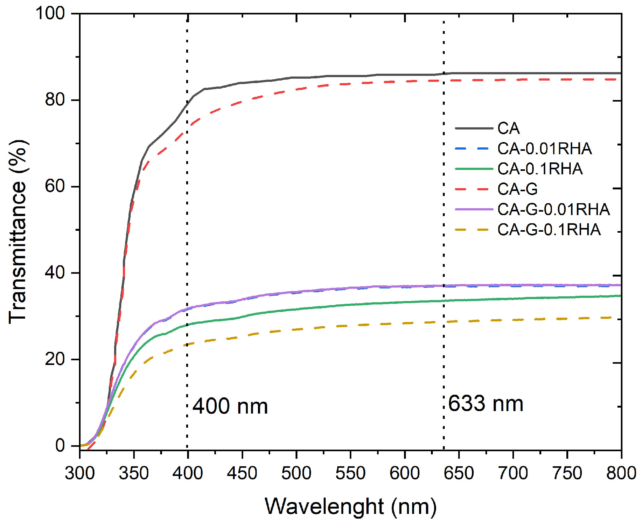 Increasing the RHA content further suppresses transparency, CA-0.1RHA decreases to 33.52% (633 nm) and 28.05% (400 nm), and the highest-loading plasticized composite (CA-G-0.1RHA) exhibits the lowest transmittance overall (28.66% at 633 nm and 23.53% at 400 nm).