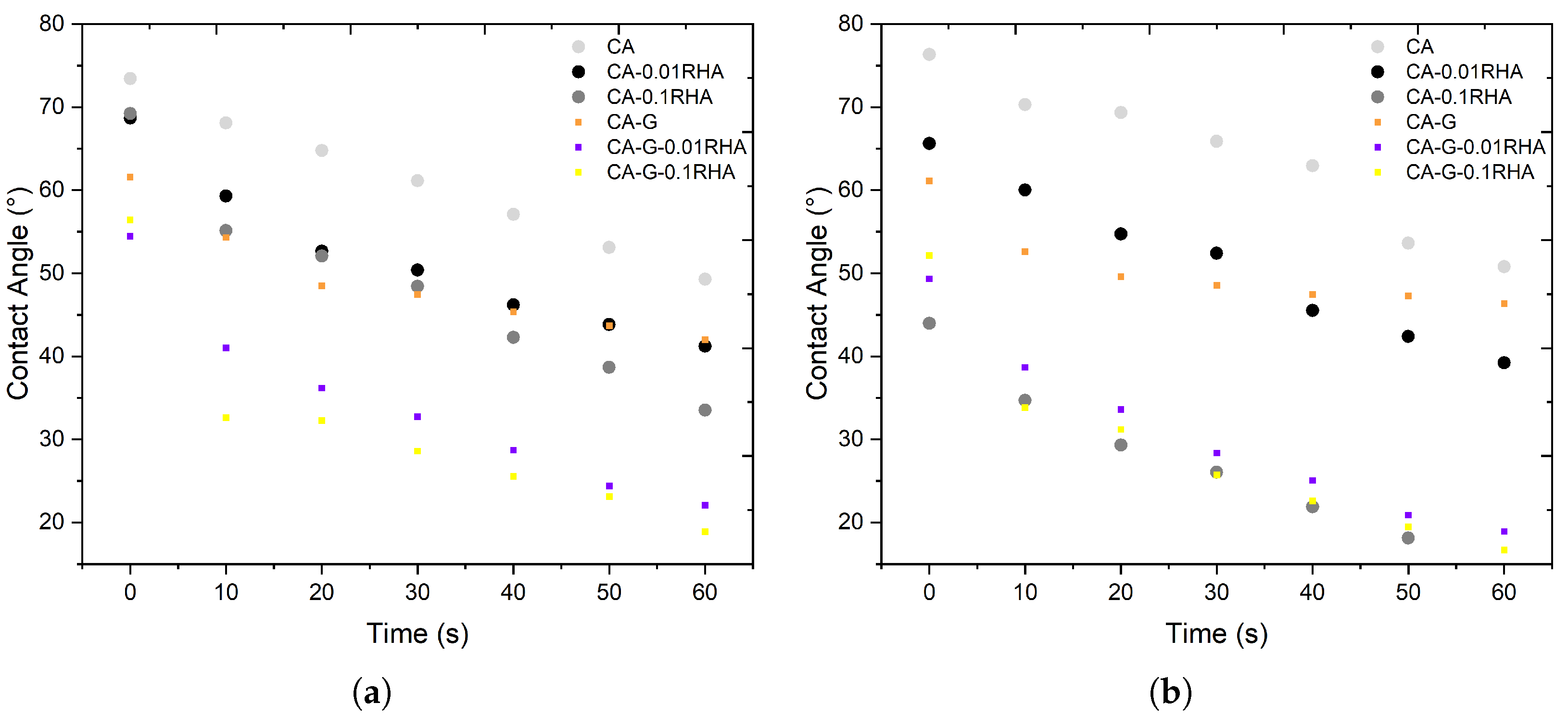 38]. This effect is amplified when glycerol is combined with RHA (CA-G-0.01RHA and CA-G-0.1RHA), yielding the lowest angles and fastest wetting.