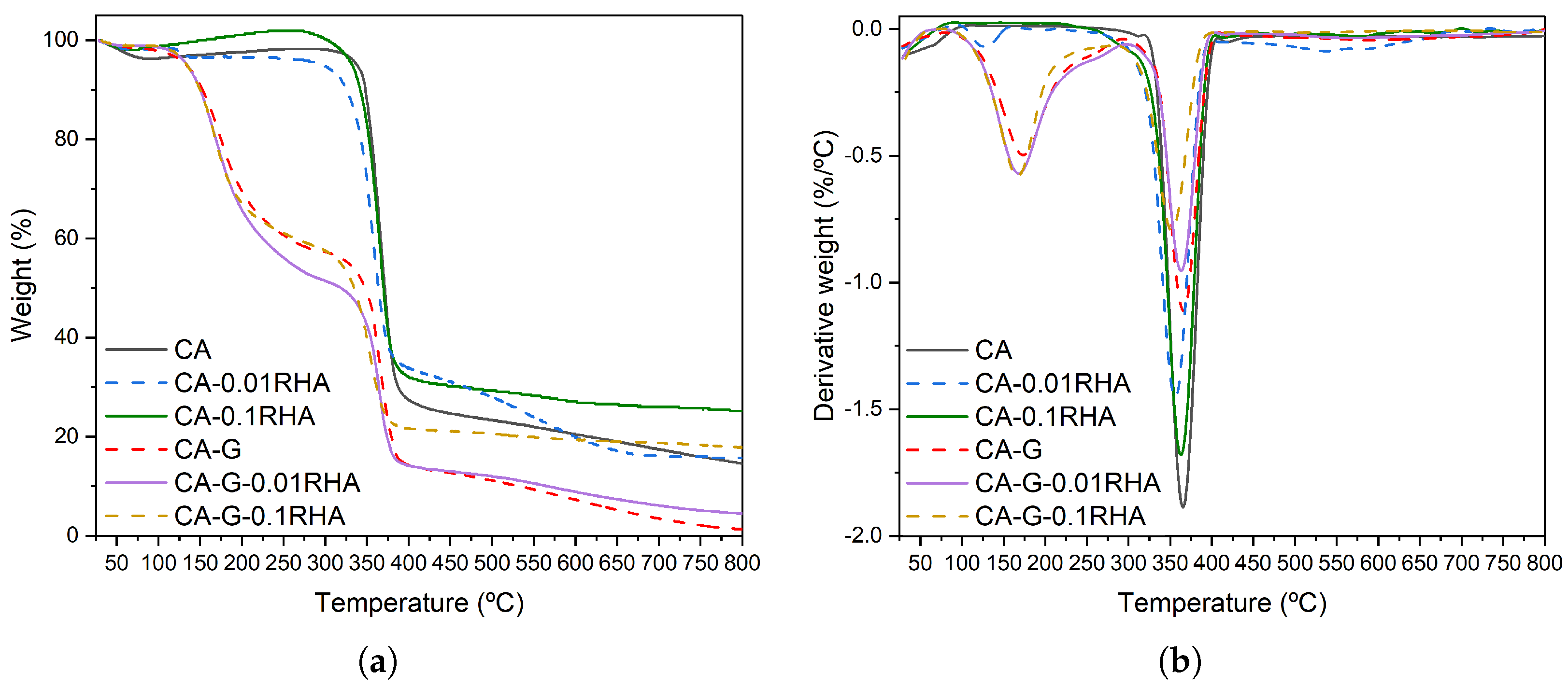 In addition, in the 550–650 °C region, the weak DTG is most clearly resolved for CA-0.01RHA ( ≈ 576 °C). For CA-0.1RHA it approaches the DTG baseline and is therefore only visible as a faint shoulder. In the glycerol-containing formulations CA-G-0.01RHA and CA-G-0.1RHA, this feature is not clearly distinguished, which may reflect masking by the additional plasticizer-related mass-loss profile and the lower amount of high-temperature residue available for slow devolatilization and minor ash-associated transformations. Accordingly, this interpretation is suggestive and supports a filler-associated event rather than a second decomposition step of the cellulose acetate backbone.