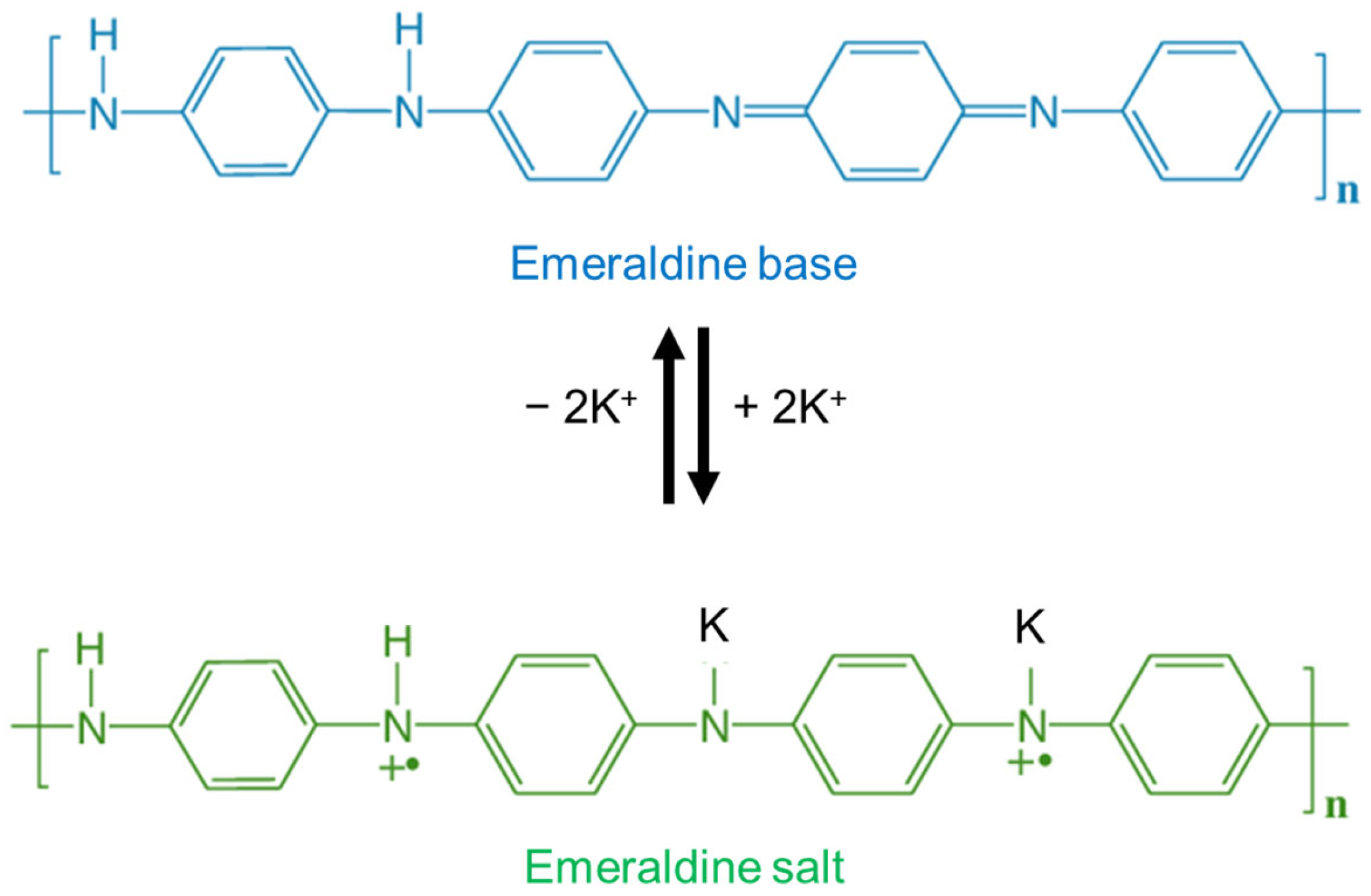 - Majeed, A.H.; Mohammed, L.A.; Hammoodi, O.G.; Sehgal, S.; Alheety, M.A.; Saxena, K.K.; Dadoosh, S.A.; Mohammed, I.K.; Jasim, M.M.; Salmaan, N.U. A review on polyaniline: Synthesis, properties, nanocomposites, and electrochemical applications. Int. J. Polym. Sci. 2022, 2022, 9047554. [Google Scholar] [CrossRef]