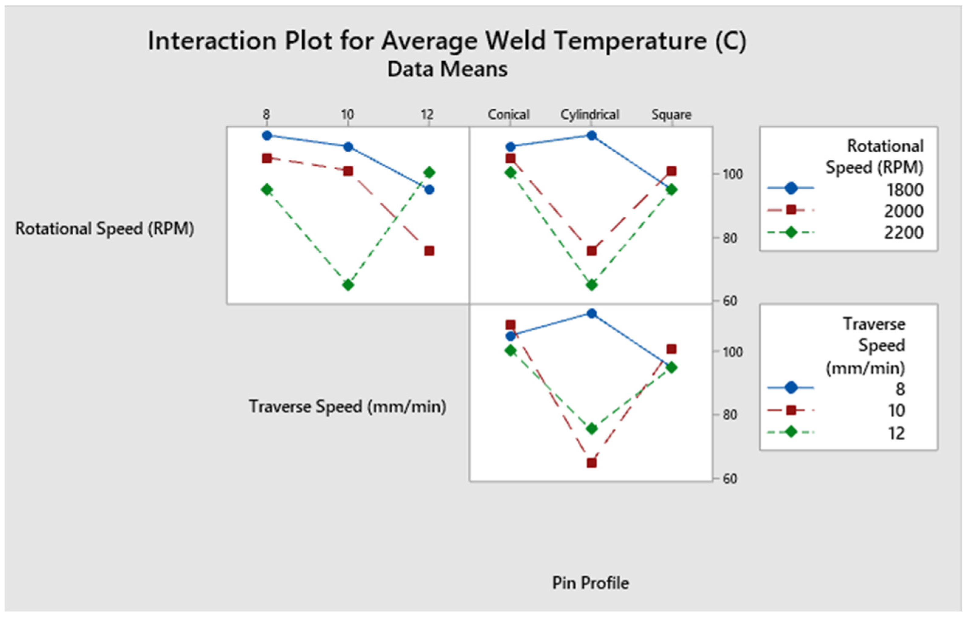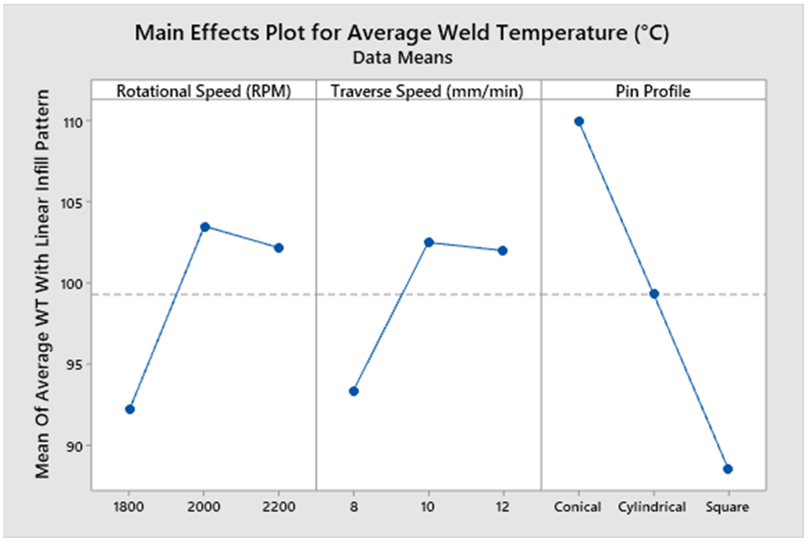 Table 4. The relatively low error value further validates the independent effects of FSBWFs on WT, demonstrating that most of the variations in WT are independently attributable to the FSBWFs. Overall, the results establish that weld zone heating in linear infilled 3PPCC is primarily governed by pin profile, with rotational speed providing secondary adjustments and traverse speed having minimal impact on WT.