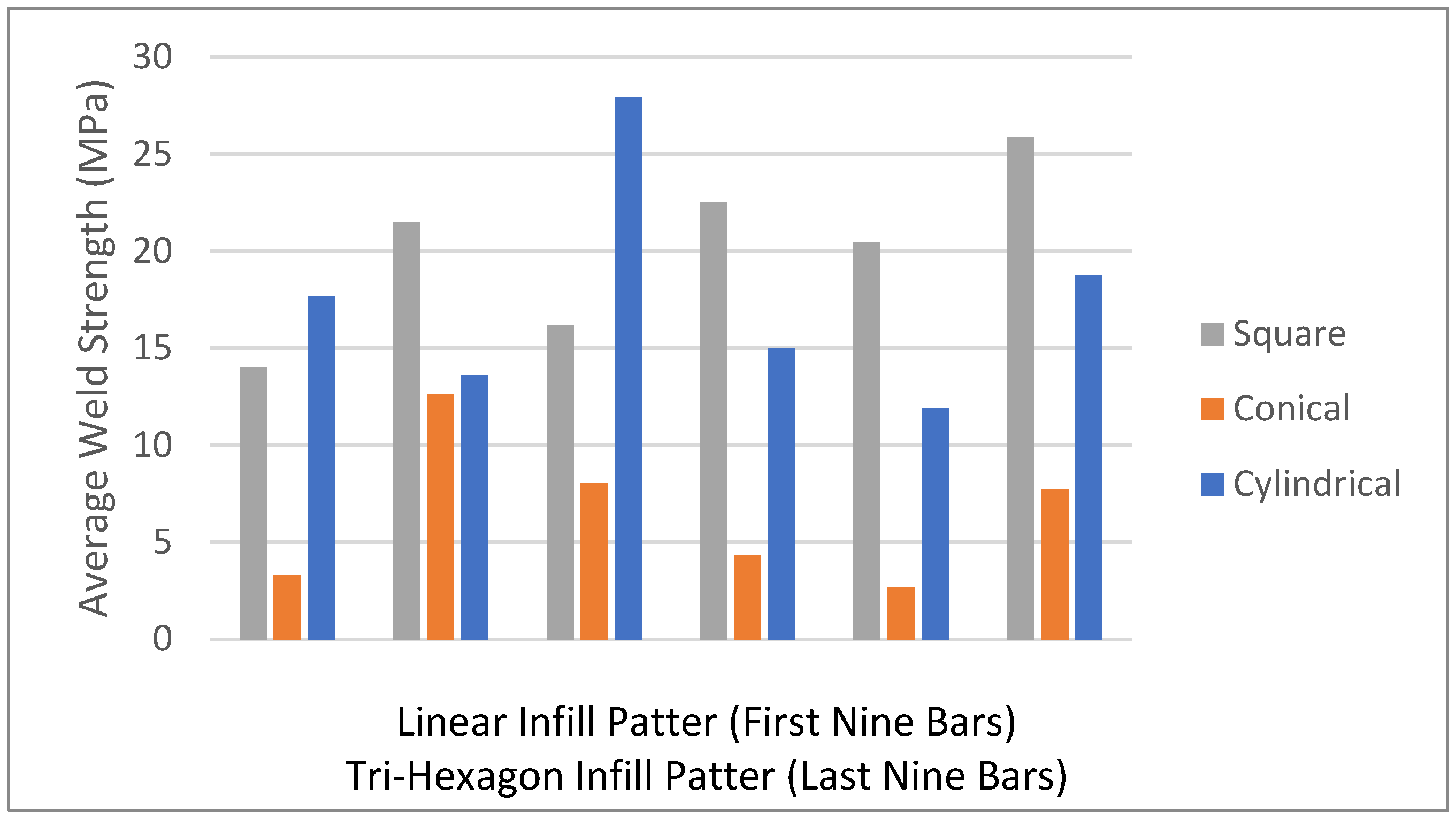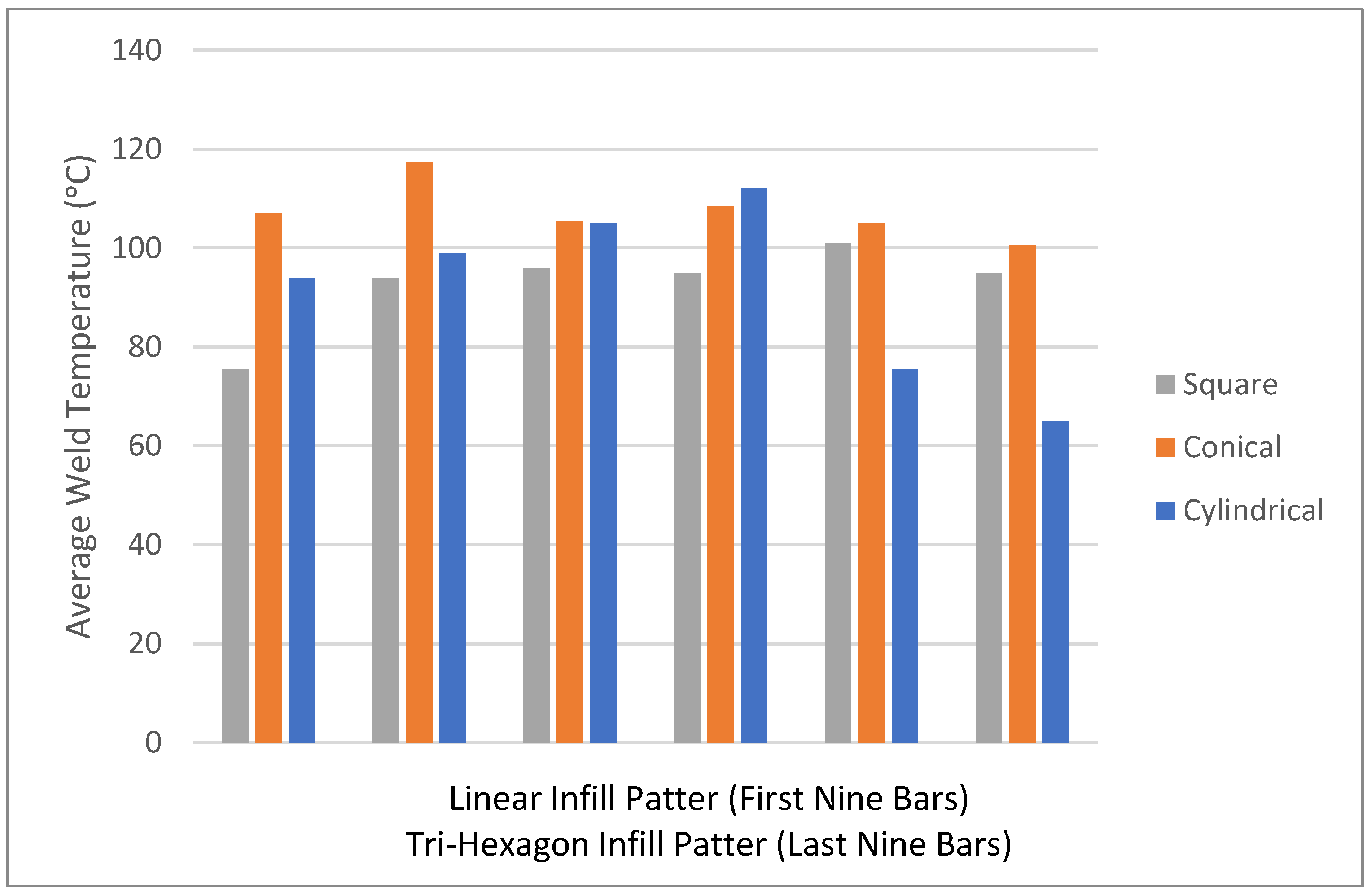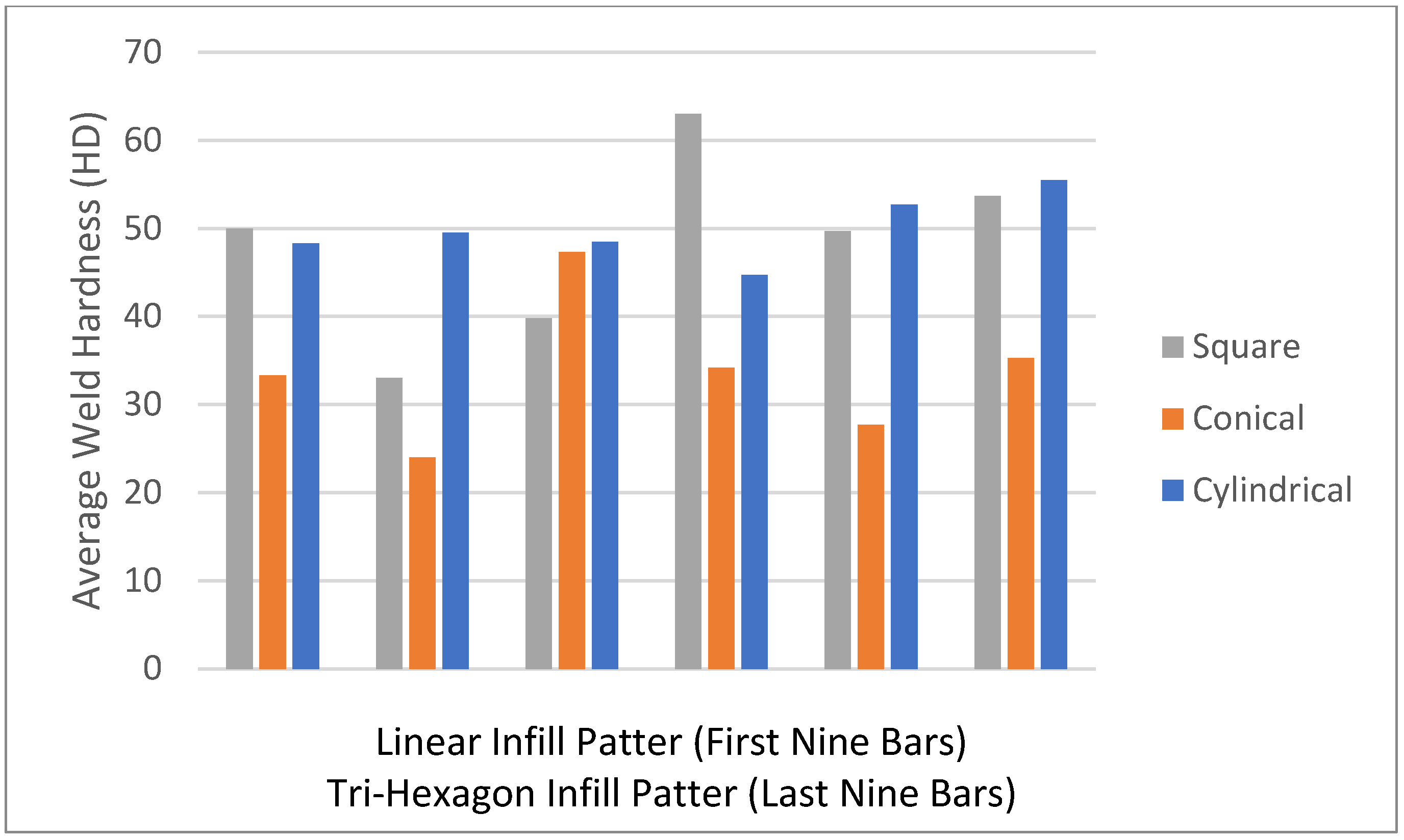 Average hardness of unwelded specimens with the linear infill pattern was 53 Shore D, and for the tri-hexagonal pattern, it was 55 Shore D.