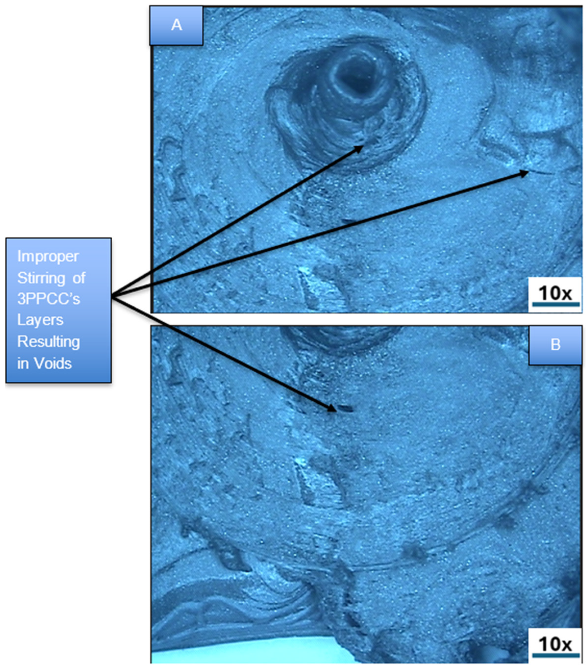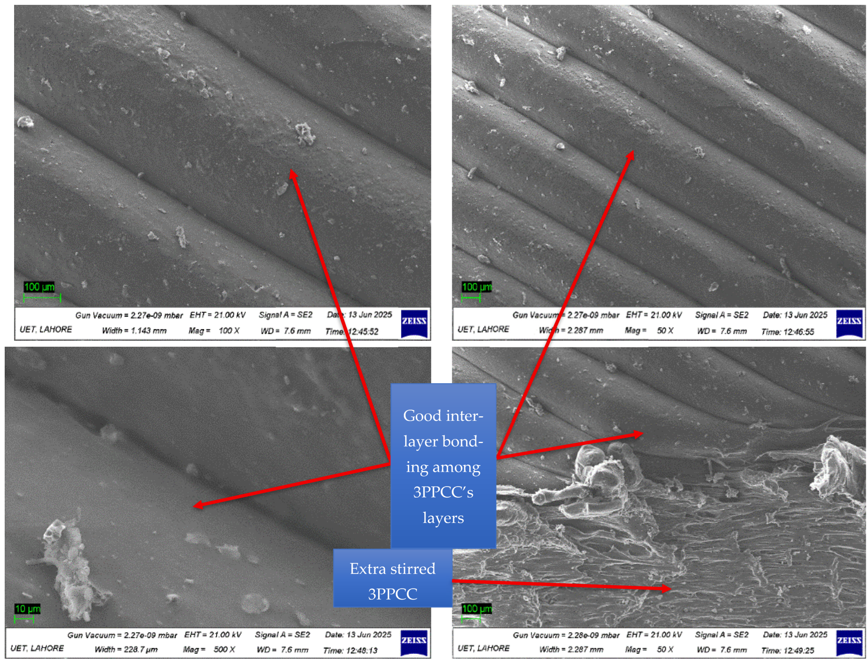 This microstructural integrity aligns with the mechanical test results confirming that the selected FSBWFs, i.e., 2200 rpm (TRS), 8 mm/min (TTS), square PP, and tri-hexagonal infill, should be confidently employed to achieve maximum WS of 3PPCC.