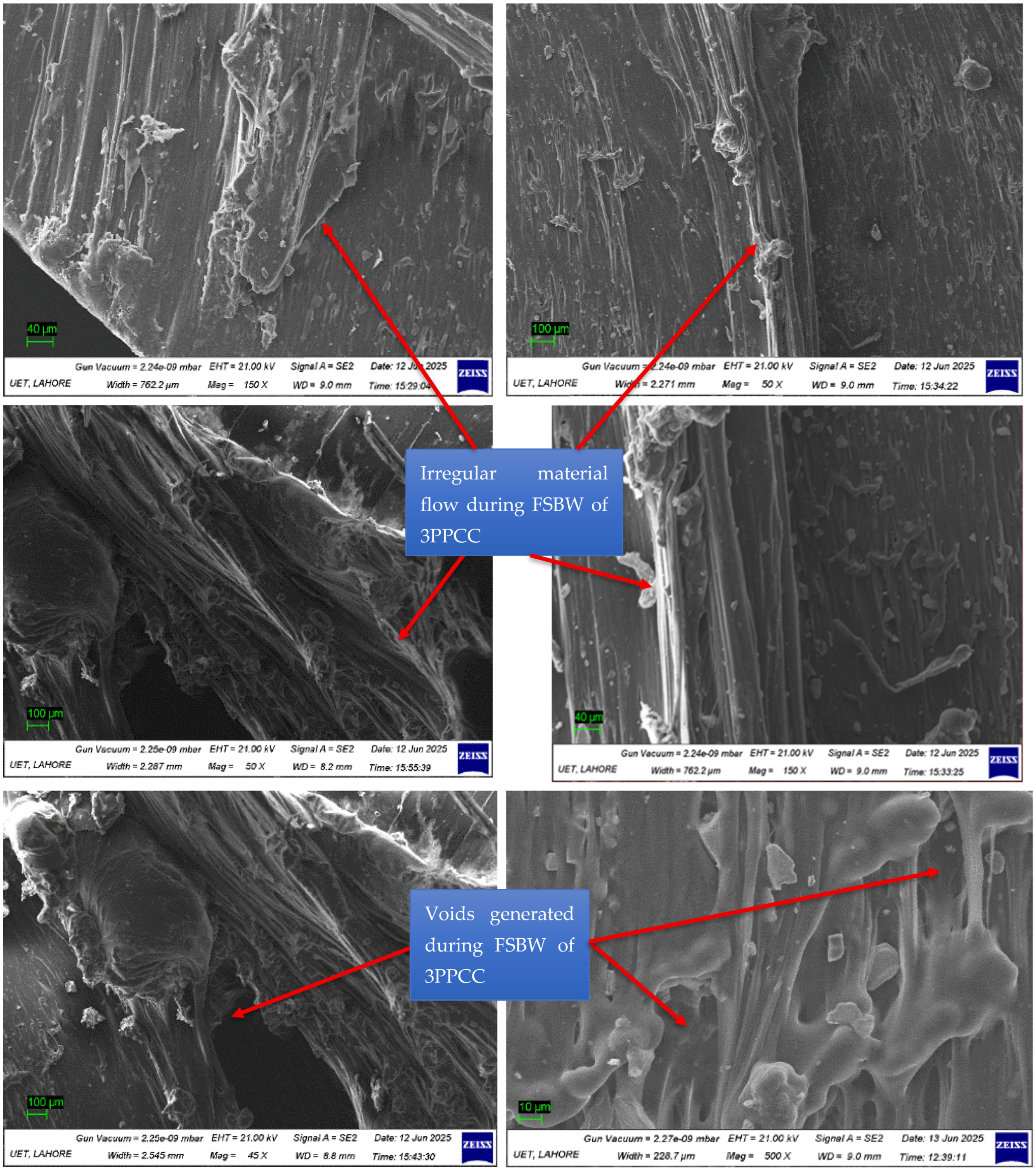 Figure S14 of SIF, SEM micrographs of sample 13 offer valuable insights into the suboptimal bonding behavior that contributed to its poor mechanical performance in terms of lower WS. At higher magnification (100x), the weld zone reveals the presence of irregular voids, un-melted or partially stirred particles, and discontinuous bonding interfaces. These defects indicate the insufficient heat generation and non-uniform plastic flow during the FSBW of 3PPCC. The observed discontinuities and void clusters suggest that the conical PP, when used at 2000 rpm and 8 mm/min, failed to provide the HAZ with the necessary stiffness, stirring, and proper plastic flow to promote thorough consolidation of the 3PPCC joint.