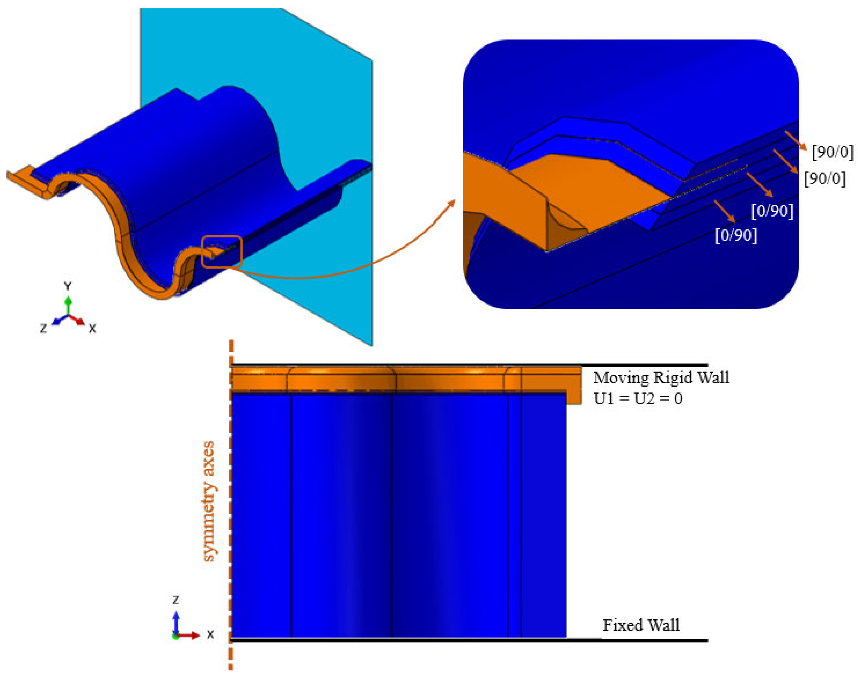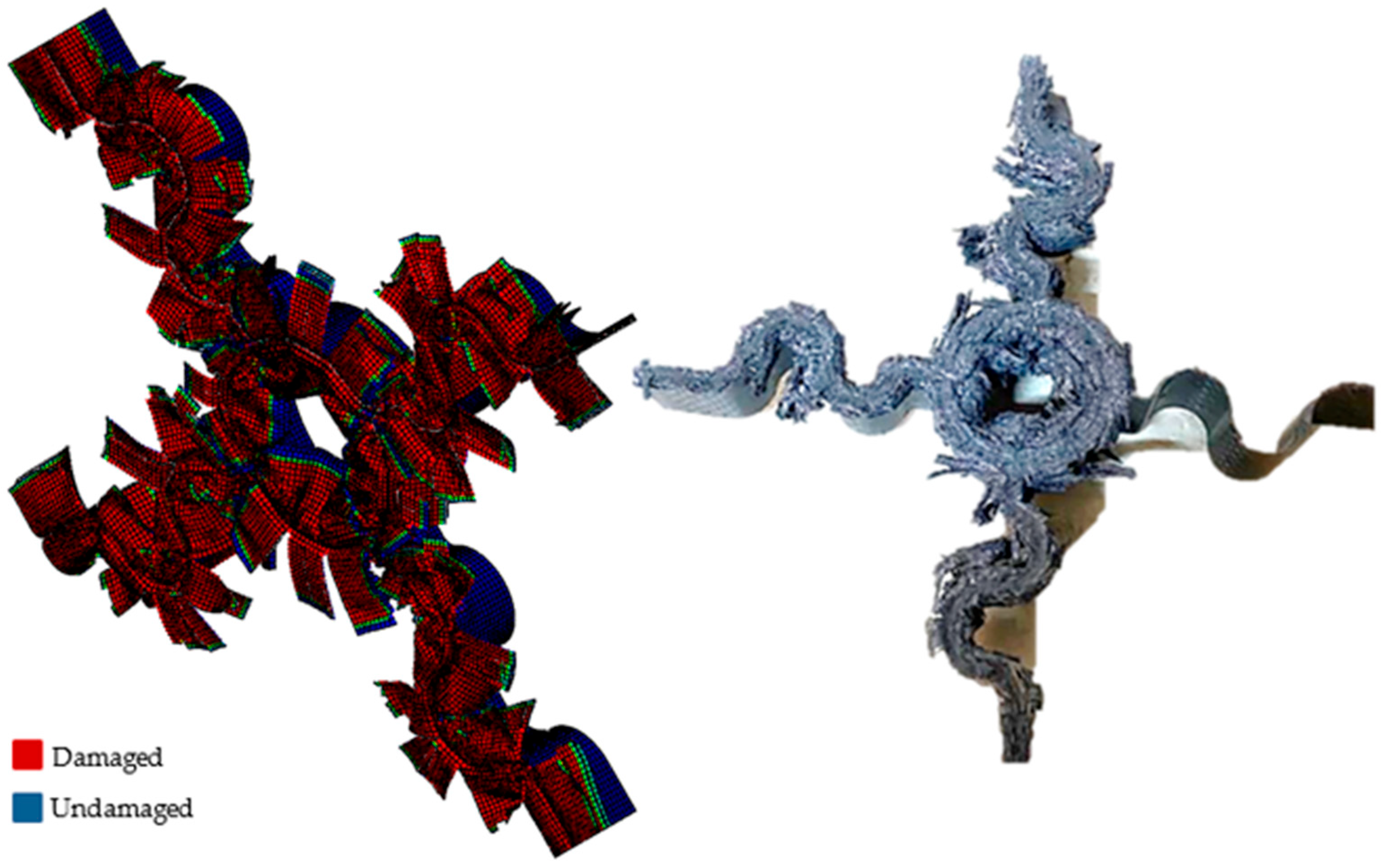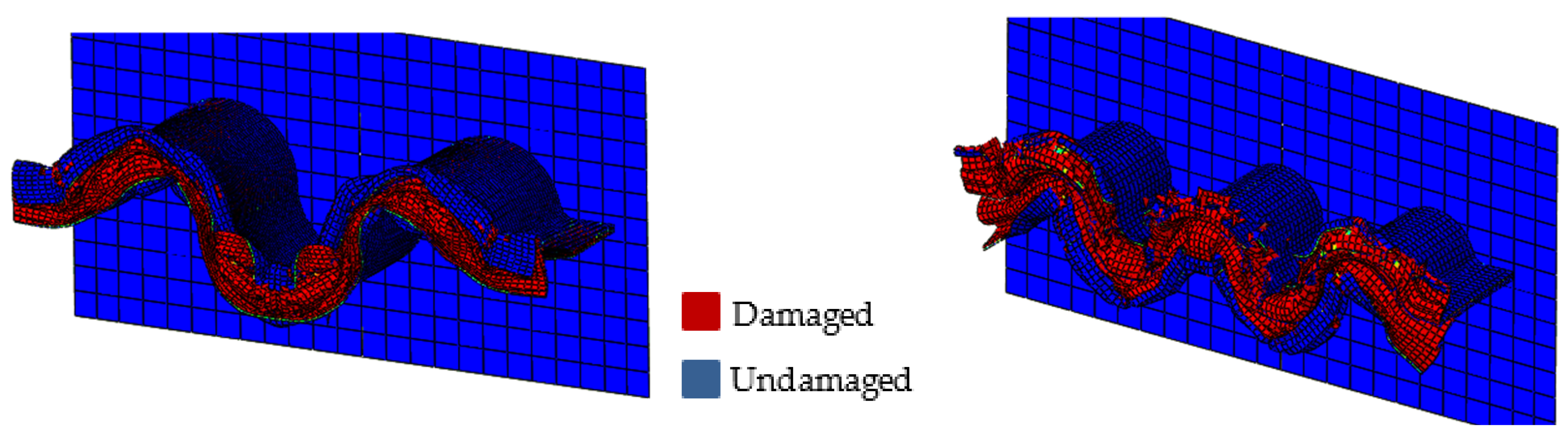 - Sokolinsky, V.S.; Indermuehle, K.C.; Hurtado, J.A. Numerical Simulation of the Crushing Process of a Corrugated Composite Plate. Compos. Part A Appl. Sci. Manuf. 2013, 42, 1119–1126. [Google Scholar] [CrossRef]