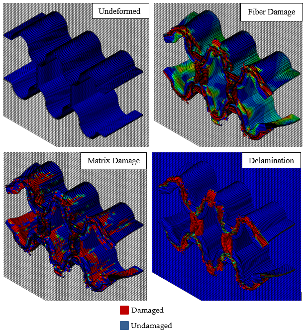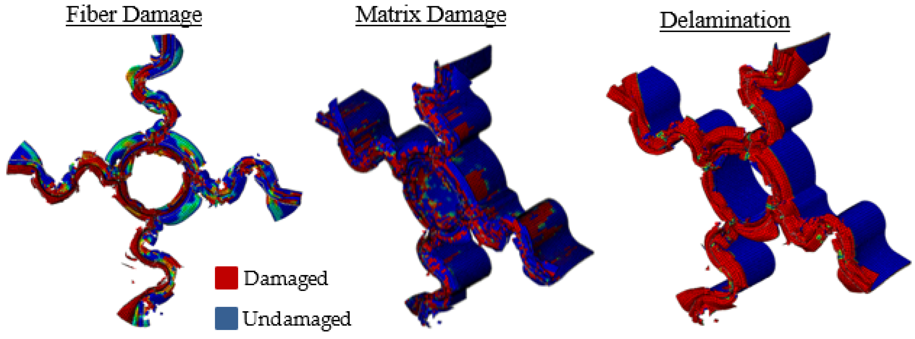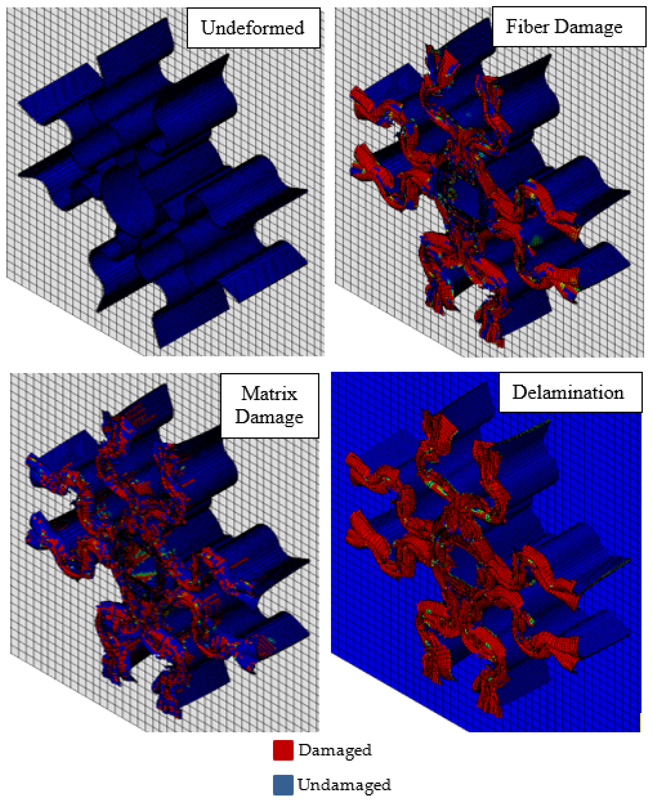 - Sokolinsky, V.S.; Indermuehle, K.C.; Hurtado, J.A. Numerical Simulation of the Crushing Process of a Corrugated Composite Plate. Compos. Part A Appl. Sci. Manuf. 2013, 42, 1119–1126. [Google Scholar] [CrossRef]