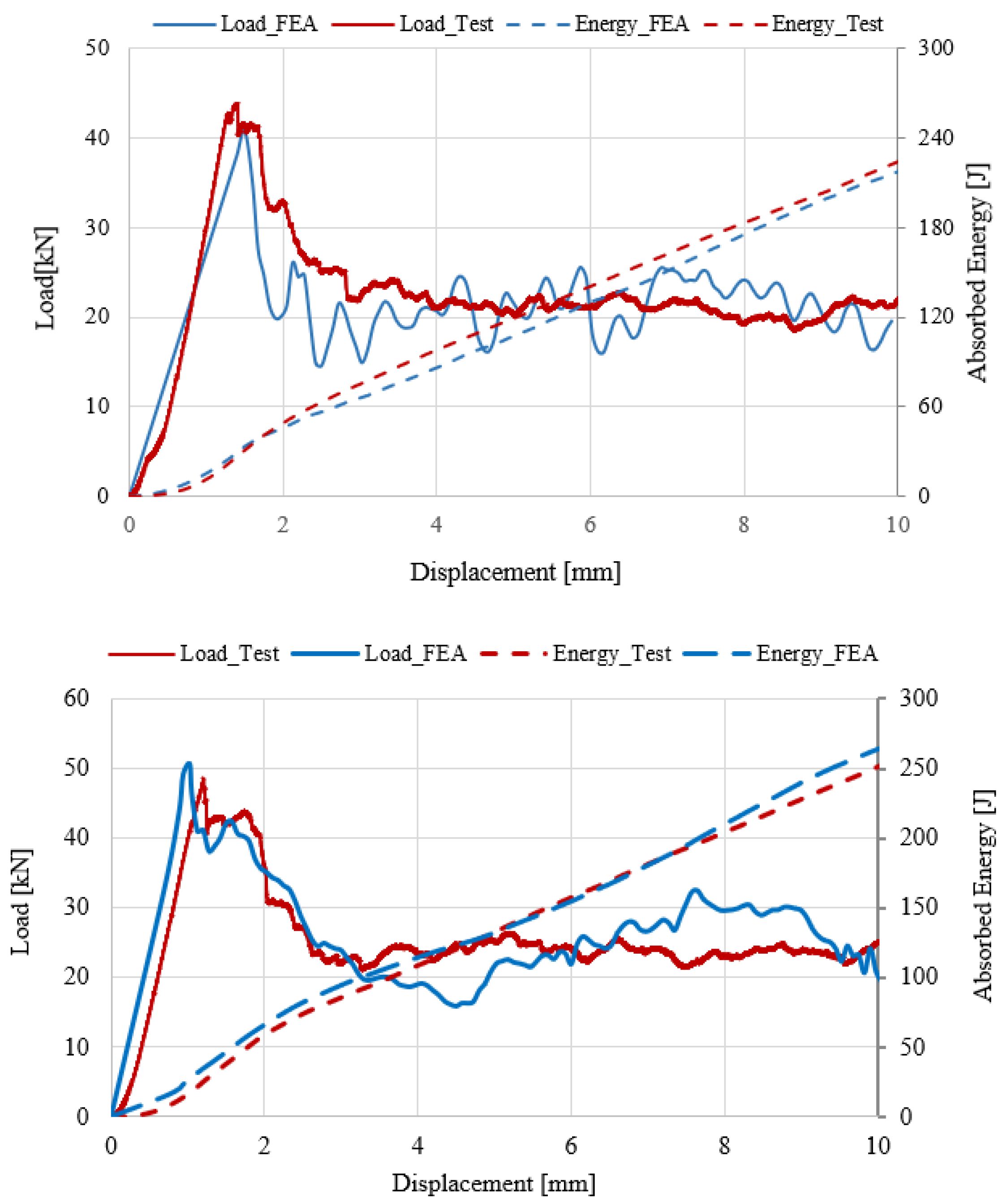 - Jimenez, M.; Larrode, E.; Revuelta, D. Effect of Trigger Geometry on Energy Absorption in Composite Profiles. Compos. Struct. 2000, 48, 107–111. [Google Scholar] [CrossRef]