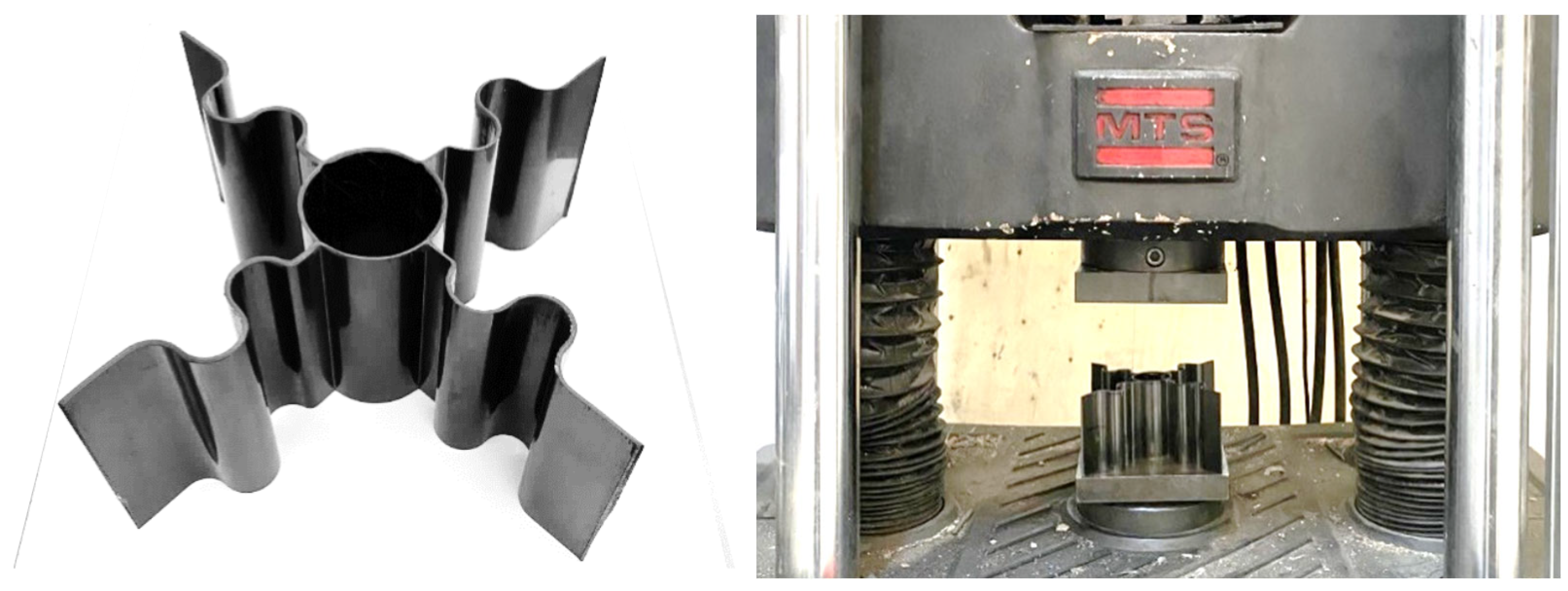 - Wu, F.; Chen, Y.; Zhao, S.; Hong, Y.; Zhang, Z.; Zheng, S. Mechanical Properties and Energy Absorption of Composite Bio-Inspired Multi-Cell Tubes. Thin-Walled Struct. 2023, 18, 110451. [Google Scholar] [CrossRef]