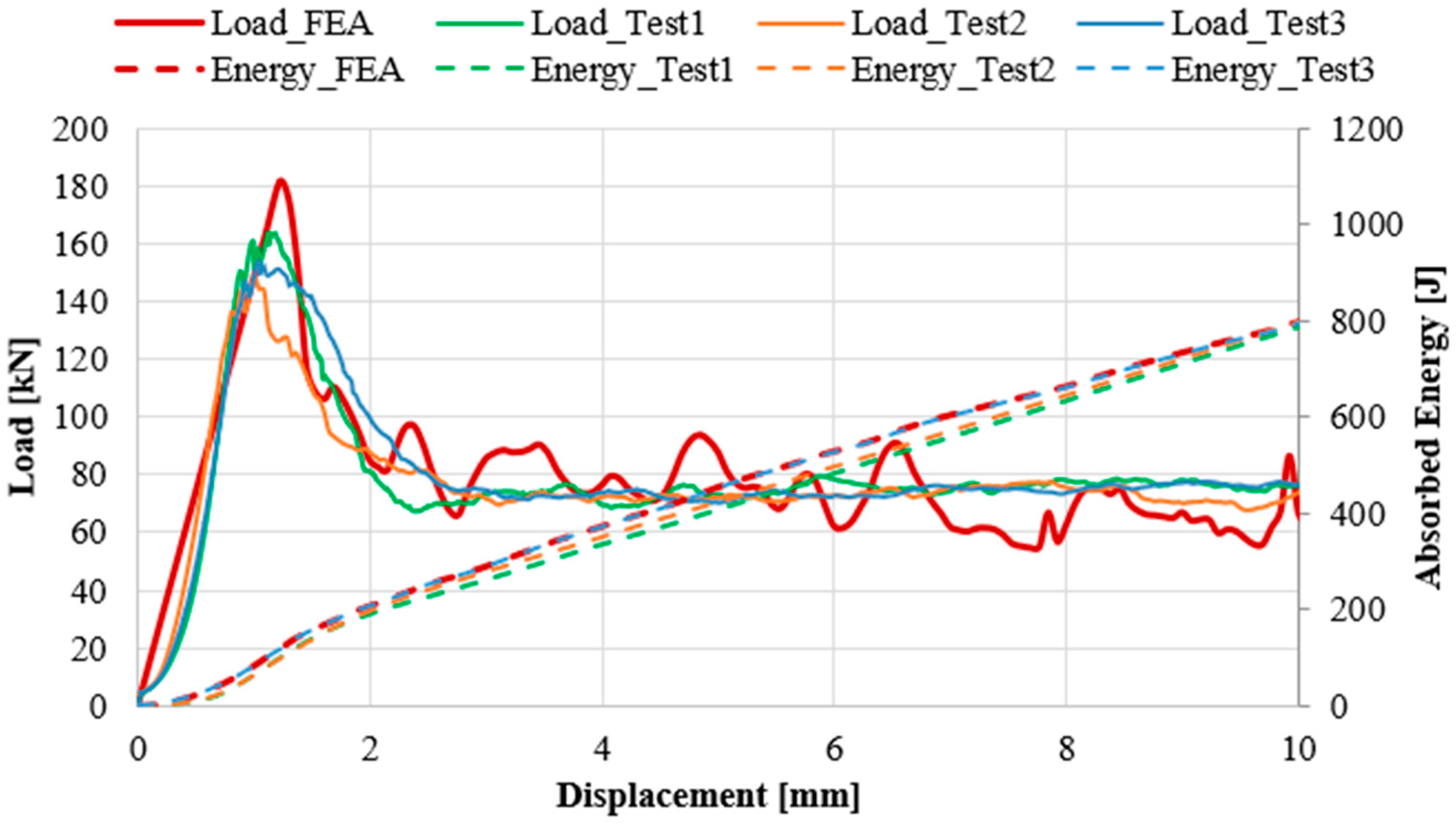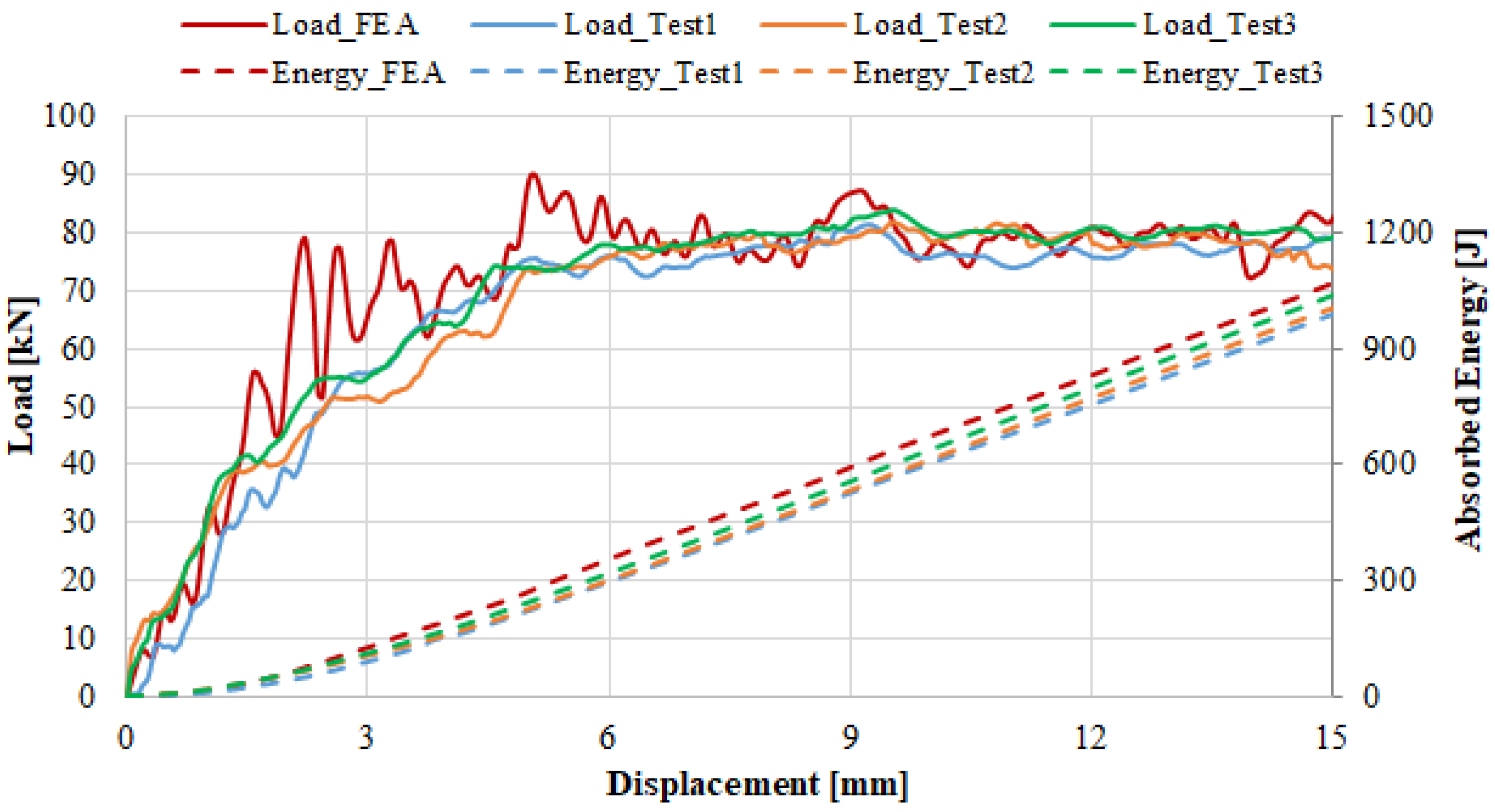 - Engül, M.C.; Öz, F.E.; Ersoy, N. Experimental and Numerical Investigation of the Crushing Process of Composite Crash Box. In Proceedings of the 21st International Conference on Composite Materials (ICCM/21), Xi’an, China, 20–25 August 2017. [Google Scholar]