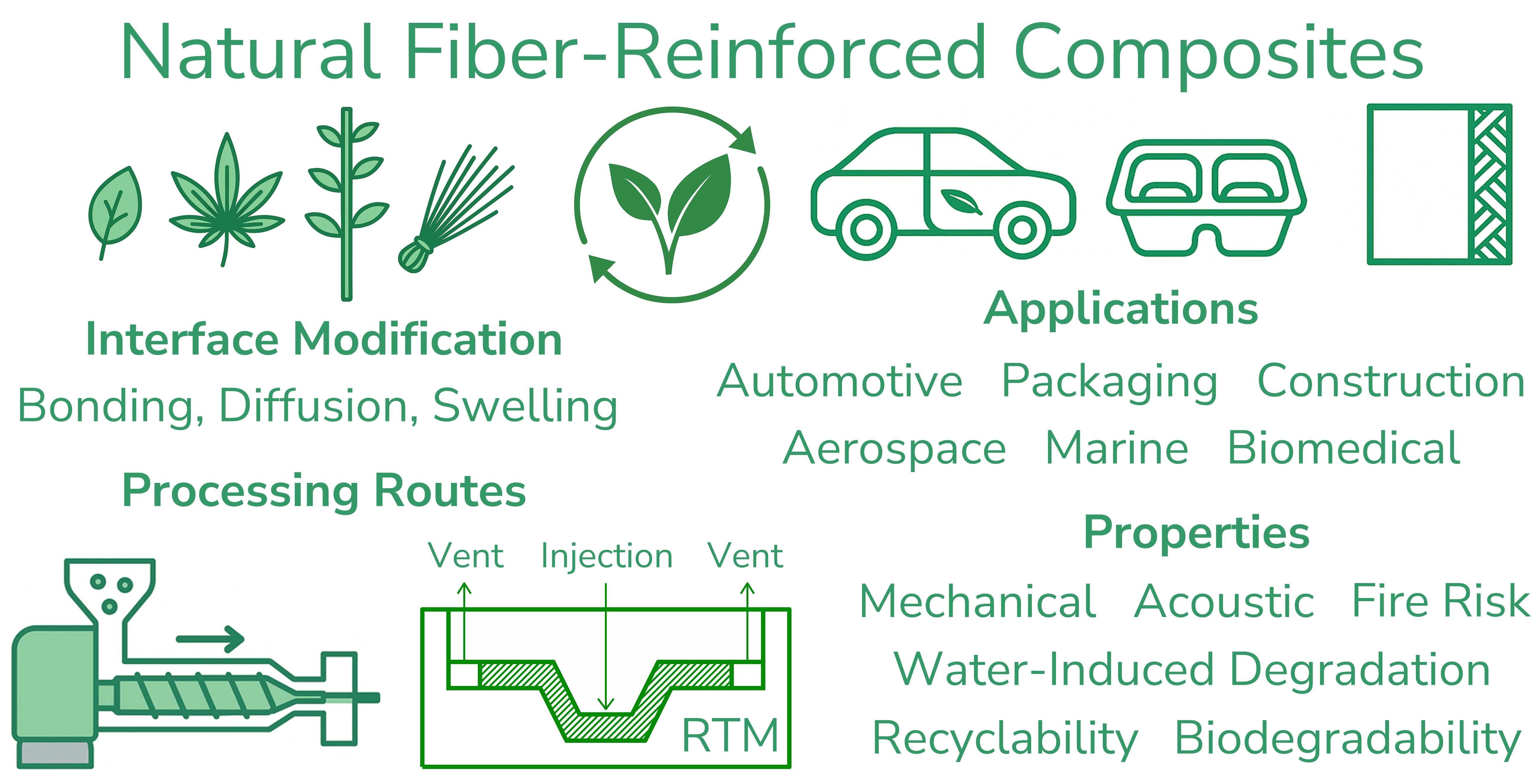| Automotive interior and exterior components | PP/MAPP (IM) or polyester/epoxy (RTM) | Kenaf (10–60 wt%) | IM: tensile strength 38 MPa; RTM: 55 MPa. Flexural and impact properties peak at 20–30 wt% fiber content; RTM provides superior wet-out and higher ductility. Treated fibers reduce moisture uptake, and RTM parts exhibit lower water absorption than injection-molded parts. | [305] |