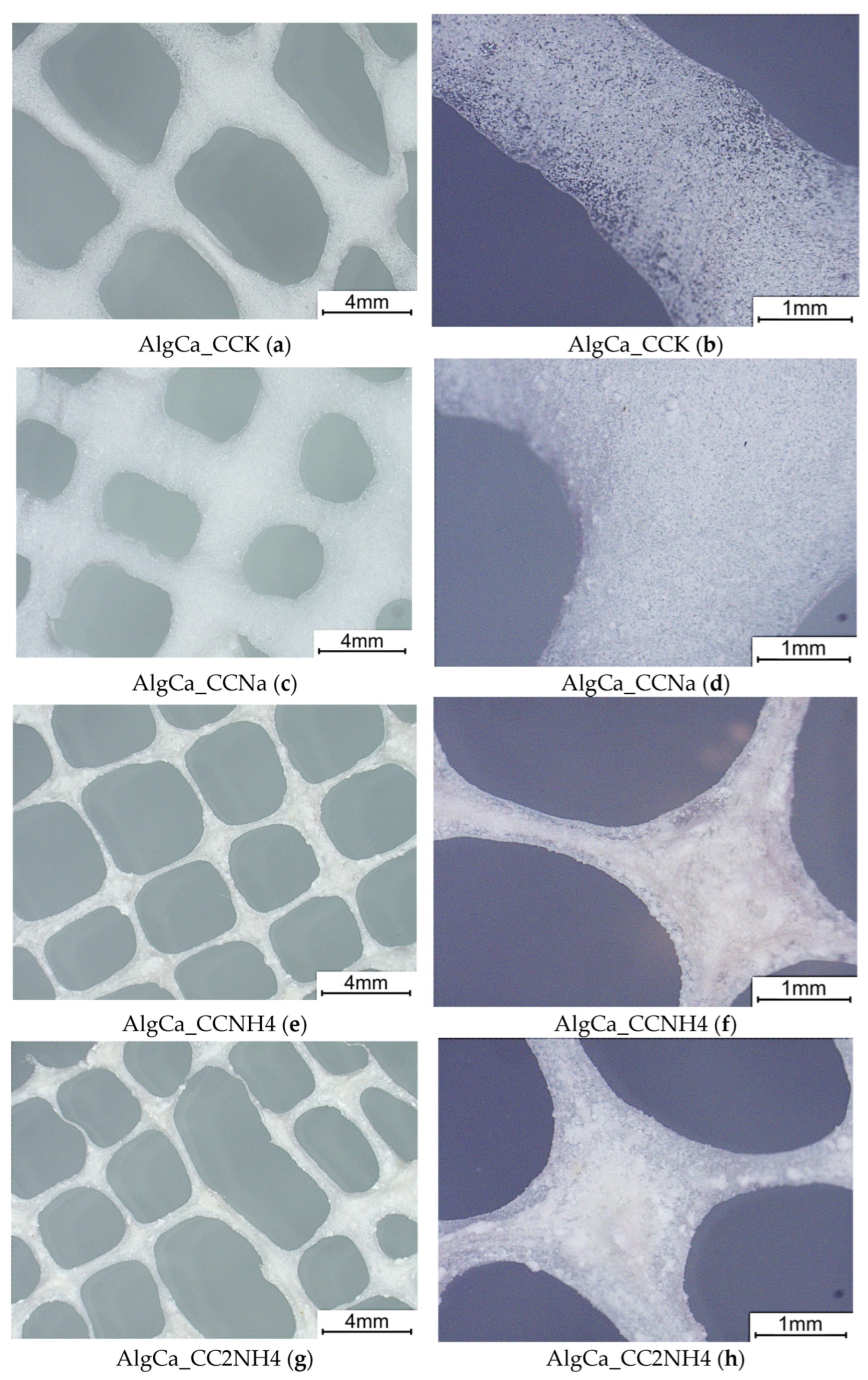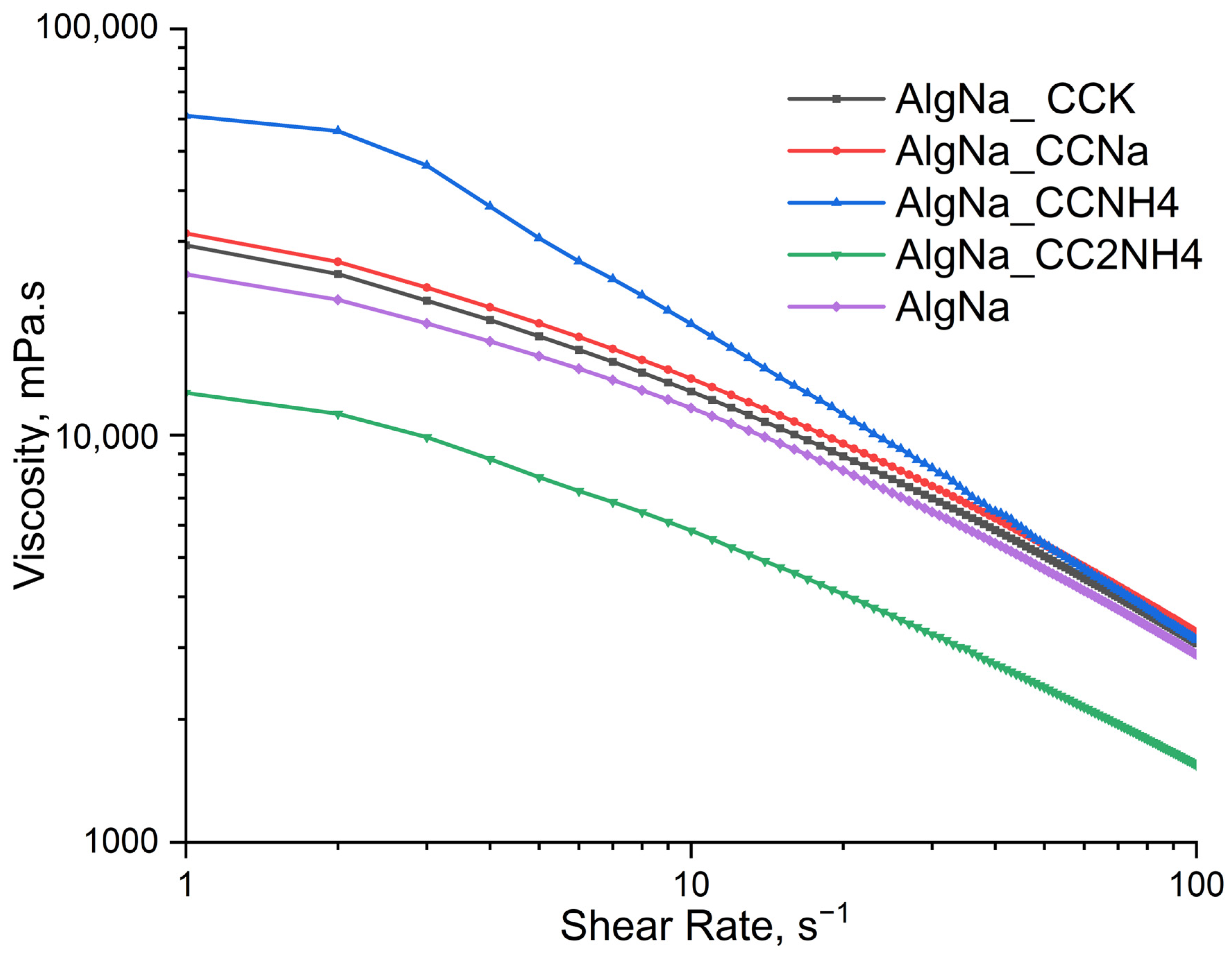 - Makarova, A.O.; Derkach, S.R.; Khair, T.; Kazantseva, M.A.; Zuev, Y.F.; Zueva, O.S. Ion-Induced Polysaccharide Gelation: Peculiarities of Alginate Egg-Box Association with Different Divalent Cations. Polymers 2023, 15, 1243. [Google Scholar] [CrossRef]