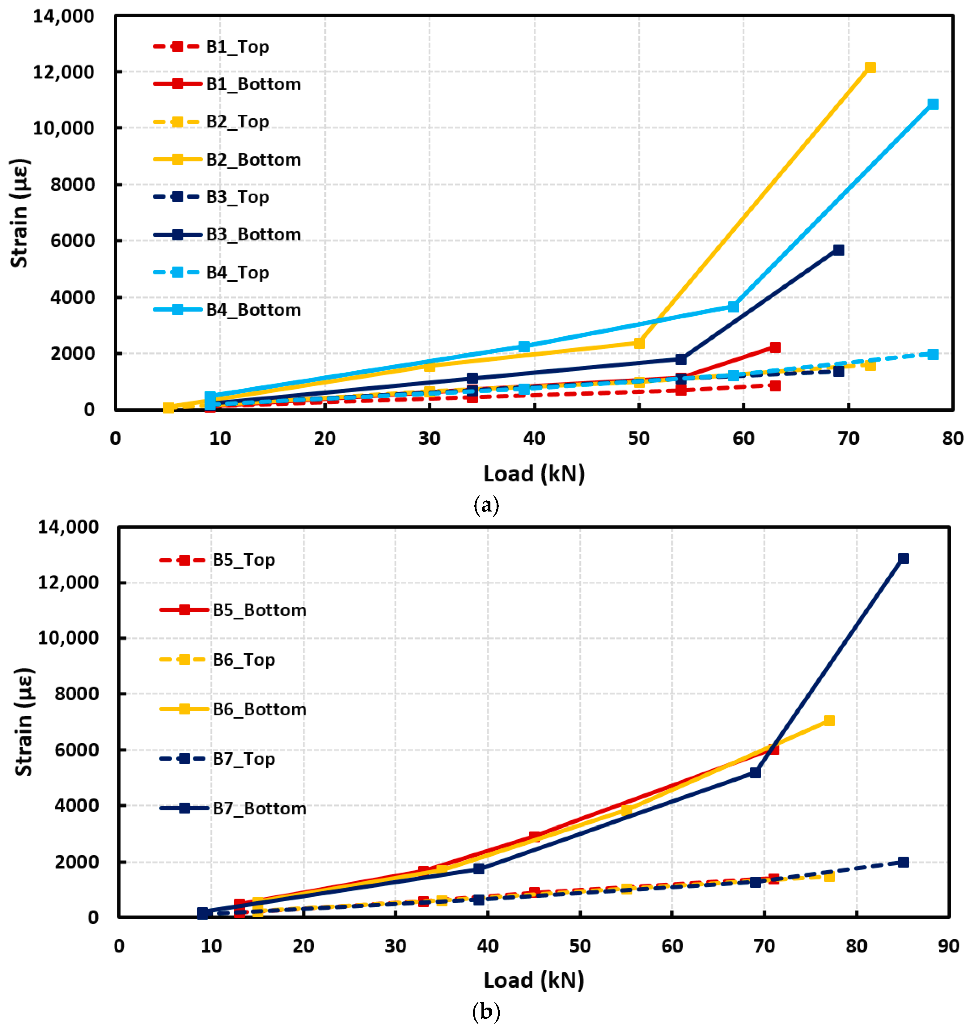 Figure 4b, the influence of the coating was again evident. The uncoated double-layer specimen (B5) developed bottom strains of about 6000 με at failure, while the coated beams achieved much higher values. Beam B6 (thin coating) reached bottom strains over 7000 με, while the embedded configuration (B7) exhibited the largest tensile strain capacity of the entire program, exceeding 12,800 με before rupture. The enhanced performance of B7 confirms the beneficial role of embedded coatings in anchoring CFRP and sustaining higher load levels.