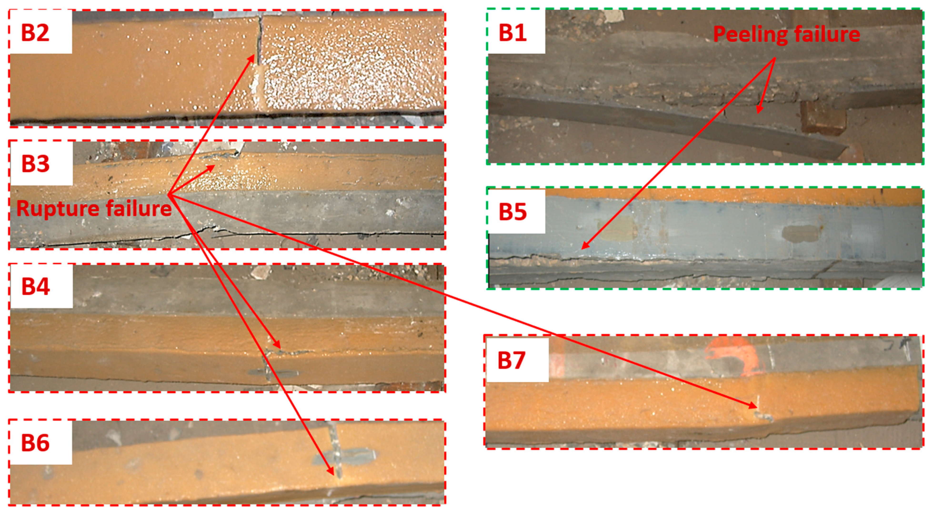 Although all the coated specimens ultimately failed by CFRP rupture, the corresponding failure loads varied noticeably among them. This difference arose because, even under the same nominal failure mode, the effective strain distribution in the CFRP was not identical. Different coating configurations, thin, thick, or embedded, altered the way shear and peel stresses were transferred across the interface, influencing how much of the CFRP length became effectively engaged before rupture. Thicker and embedded coatings improved stress uniformity and reduced local debonding, allowing the CFRP to reach higher effective strain levels and thus sustain greater loads. The photographs confirm that B5 (uncoated double-layer) failed by premature CFRP peeling, similar to B1, while B6 and B7 both failed by CFRP rupture at or near the midspan, consistent with the single-layer-coated specimens. The visual comparison clearly illustrates the transition from debonding-controlled to rupture-controlled failure as the coating confinement increased, regardless of the number of CFRP layers.