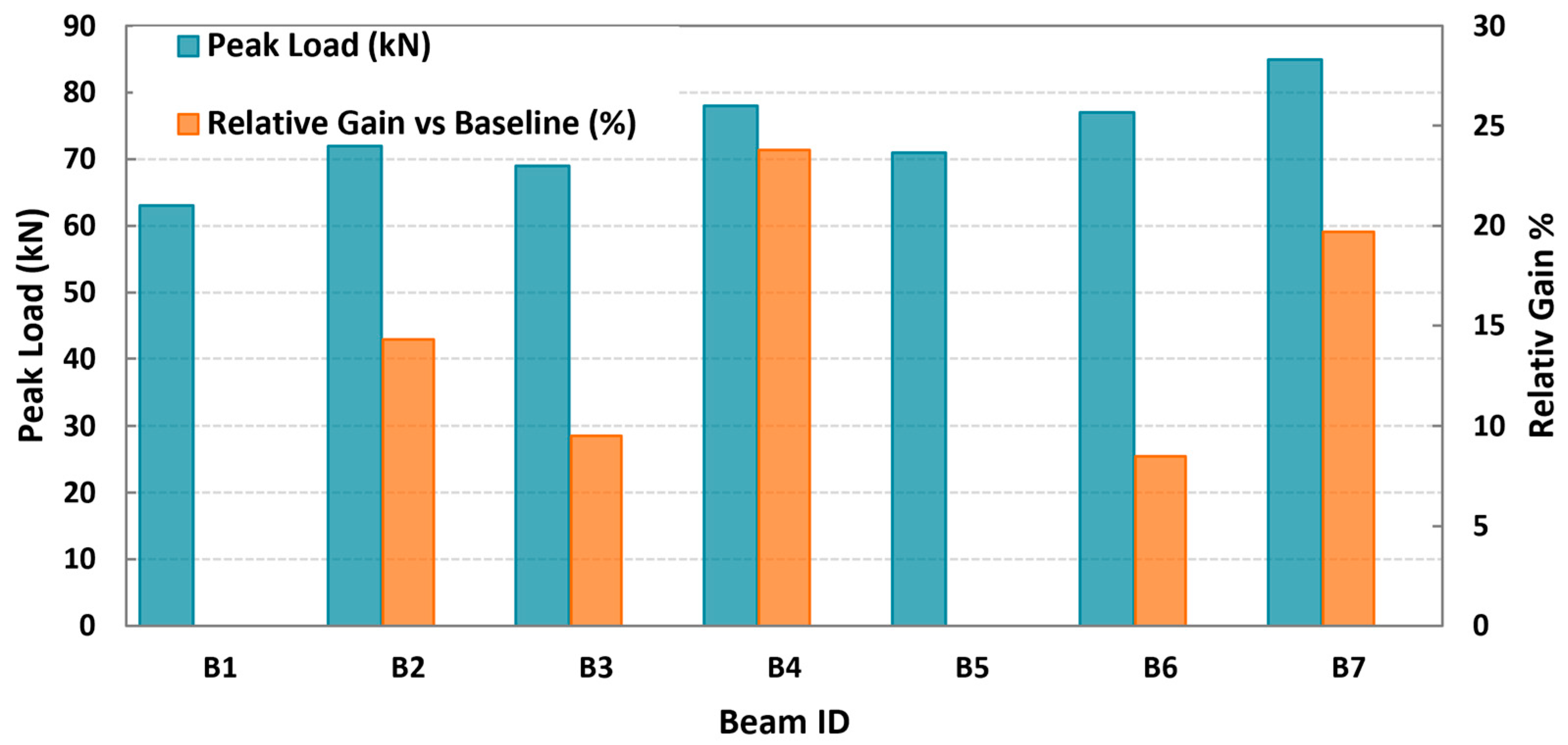 Figure 6 shows the comparative analysis of peak load and relative gain for each beam.