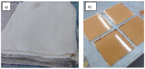 The composites were produced by compression molding, with a 20-ton manual bench press machine from Rondol Technology Ltd. (Staffordshire, UK). The hybrid yarn prepreg fabric was cut into 19 cm × 19 cm squares (Figure 1a). For each composite, 10 layers of the prepreg were used, in a 0/90-degree bidirectional lay-up. These prepregs were then put into an oven at 70 °C, to dry for at least 24 h before processing. The composites were then processed by two different methods: the experimental method (EM), where the parameters were determined during previous experiments [12] (Figure 1b), and the new method, where the parameters were determined by the FE simulation. These methods are listed in Table 2, where for the FE method a sequential pressure application is described, first with a higher value for a corresponding holding time, followed by a lower value and according holding time.