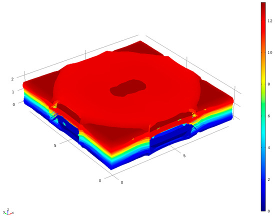 Simulation of pressure parameter: displacement to 2.5 mm with the PLA’s Young’s modulus at 100 °C and a pressure application of 0.5 MPa, displacement shown in mm.