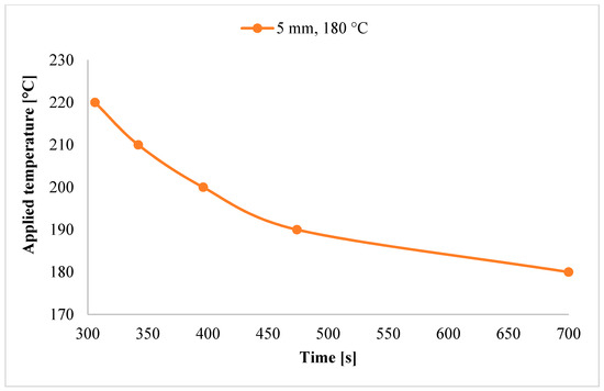 Time to complete a heat transfer of 180 °C, with differing applied temperatures, for a composite thickness of 5 mm.