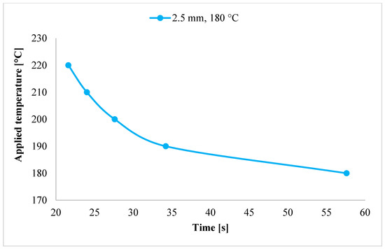 Time to complete a heat transfer of 180 °C, with differing applied temperatures, for a composite thickness of 2.5 mm.