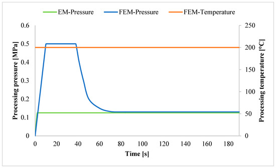 Processing values for pressure, temperature, and time determined with the FEM, compared with the pressure value for EM.
