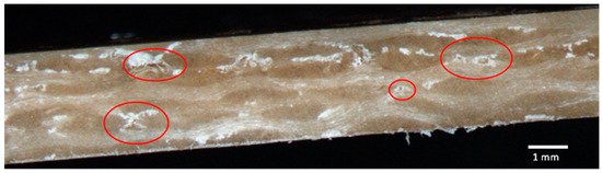 Microscopical picture of the Hemp-EM composite with several voids at the fiber-matrix interface, marked in red.