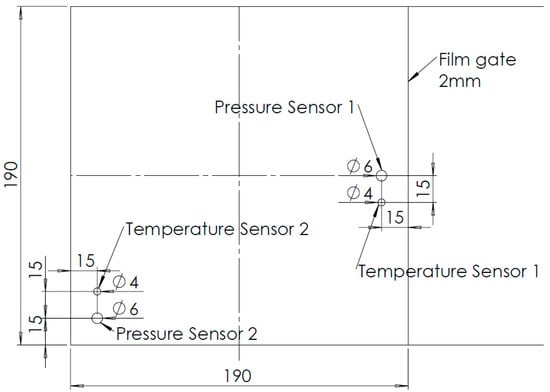 For the experimental study, an electrically heated plate mold equipped with pressure and temperature sensors is used. It is a symmetrical two-cavity mold with a variable plate thickness between two and five millimeters. For the experimental studies described here, a constant wall thickness of 2 mm is chosen. Both plates have a square shape with an edge length of 190 mm. The sprue has a start diameter of 9 mm (inlet), expands to 15.5 mm and is 185 mm high. Figure 1 shows the complete molded part with sprue system. The position of the pressure and temperature sensors in one of the mold cavities is shown in Figure 2.