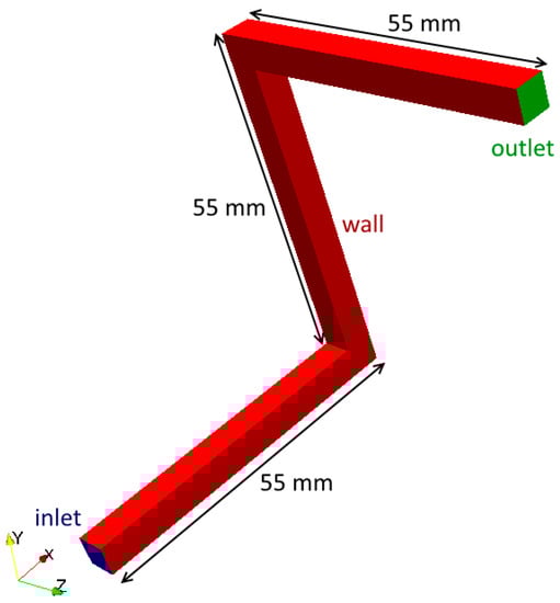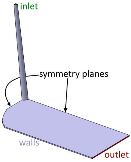 Since the mold is symmetric in two directions (cf. Figure 1), only a quarter of the mold is simulated to reduce the computation time. The model with predefined boundary face types is shown in Figure 3. To replicate the experiments, four simulations with different process settings are conducted. Thus, two different injection speeds and two different mold temperatures are modeled. For pressure validation, the FVM-based solver is compared to the experimental results and also to FEM results. The FEM simulations are conducted with Autodesk Moldflow Insight 2018.1, also using Castro-Macosko viscosity and the Kamal-Malkin kinetic model [,,]. The FEM model is meshed in Moldflow with a global edge length of 3.06 mm and eight elements over thickness. The FVM model is meshed with the OpenFOAM meshing tools BlockMesh and snappyHexMesh. Therefore, a base mesh with an edge length 2 mm is used, the refinement of all surfaces is set to level 2 and one additional surface layer is created.