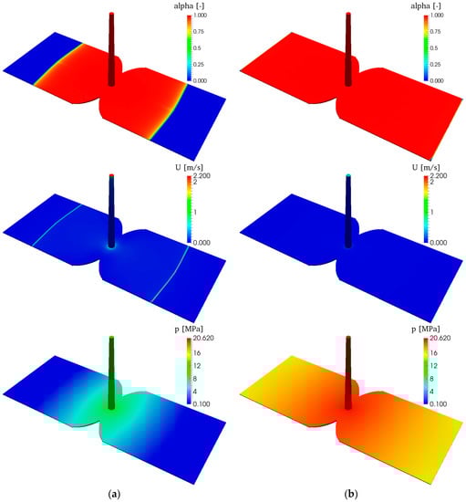 Figure 5 shows the FVM simulation results for a filling rate of 137.5 cm3/s and a mold temperature of 170 °C. Displayed are (from top to bottom) the filling level (via VoF), the velocity in m/s and the pressure in MPa at 1 s (Figure 5a), where the filling is velocity-controlled, and at 1.5 s (Figure 5b), where it is pressure-controlled and should be just filled.