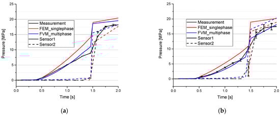 Figure 8. Pressure as a function of time for a filling speed of 250 cm3/s and a mold temperature of 170 °C (a) and 190 °C (b). Comparing measurement (black), FEM (red) and FVM (blue) at sensor Position 1 (solid line) and 2 (dotted line).