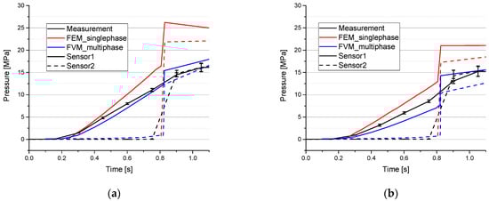 Figure 7. Pressure over time for a filling speed of 137.5 cm3/s and a mold temperature of 170 °C (a) and 190 °C (b). Comparing measurement (black), FEM (red) and FVM (blue) at sensor position 1 (solid line) and 2 (dotted line).