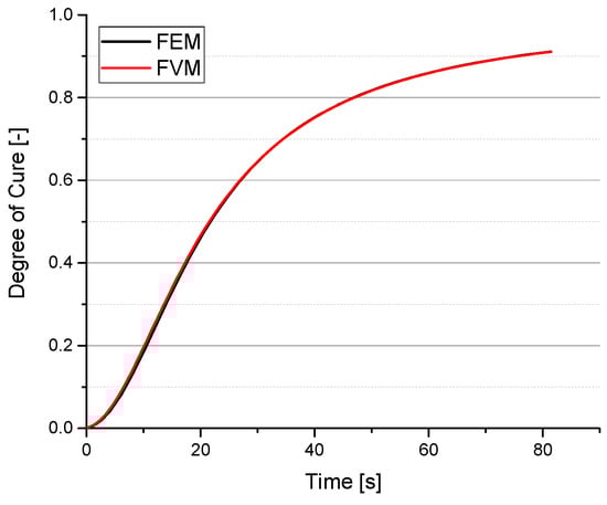 Figure 9. Degree of cure as a function of time for FEM (black) and FVM (red) for a filling speed of 137.5 cm3/s and a mold temperature of 170 °C.