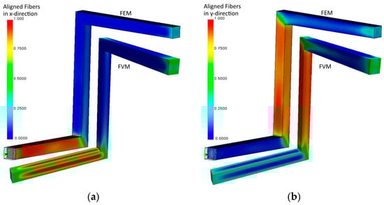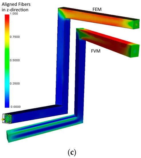 Regarding the fiber alignment in x-direction (Figure 10a), a deviation especially in the edges can be detected. In the FEM model, a high orientation right at the beginning can be detected, while the FVM result aligns only after a few millimeters. The results in y-direction fit well, while in z-direction the FVM-solver predicts a slightly higher alignment of about 10%. The FVM solution has a higher scattering in the transition area.