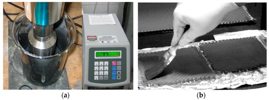 As a first step, the exfoliated graphite nanoplatelets were further processed to break the agglomerations to form graphene. A solution of approximately 5% graphite by weight mixed in 2-isopropanol was prepared. The solution was mixed using both a mechanical stirring device and a sonicator, Figure 1a. The 2-isopropanol and graphite mixture was stirred for 30 min followed by sonication at 35 W power for 2 h with on/off pulses. The glass fabric was cut to the desired dimensions and weighed accordingly. The measured amounts of graphene in 2-isopropanol solution was then brushed onto the glass fabric until it was evenly distributed as shown in Figure 1b. The coated fabrics were placed beneath a fume hood for 24 h until the 2-isoproponal was evaporated. Samples were prepared with 0.5 wt % and 1.0 wt % graphene coated on one surface of the glass fabric and with 0.5 wt % coated on both sides of the glass fabric. Samples were also prepared by coating the surface of the glass fabric with 2-proponal to assess the effect of the solvent on processing and overall properties. These samples are referred to as 0 wt % graphene. The results were also compared to “As Received” pure glass samples.
