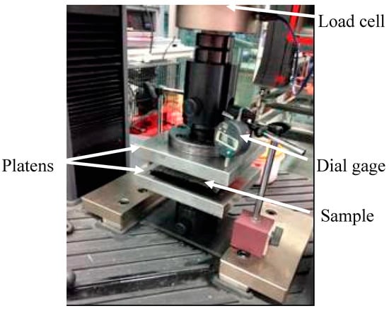 To assess the process-ability of the coated fabrics under VARTM pressure, the coated reinforcements were subjected to compaction experiments conducted under dry conditions to measure the compaction response of the glass preforms. The compaction test fixture is composed of two flat steel plates used to compact the samples. The upper and lower platen has dimensions of 15 cm × 15 cm. A laser displacement sensor (L-Gage, Banner, LG10, Minneapolis, MN, USA) and a digital dial indicator were used to monitor the crosshead displacement and thus the thickness of the sample being tested. A photo of the compaction test setup is shown in Figure 2. The fixture was mounted between upper and lower platens of an MTS Insight Material Testing Machine attached with 100 kN load cell. The output data of the L-Gage sensor was gathered using LabVIEW data acquisition software (National Instruments, Austin, TX, USA). Before using the L-Gage sensor, it must be calibrated by defining the minimum and maximum distance limits or distance range.