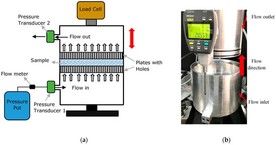 (a) Schematic diagram of Transverse Permeability Fixture; and (b) photograph of the fixture.