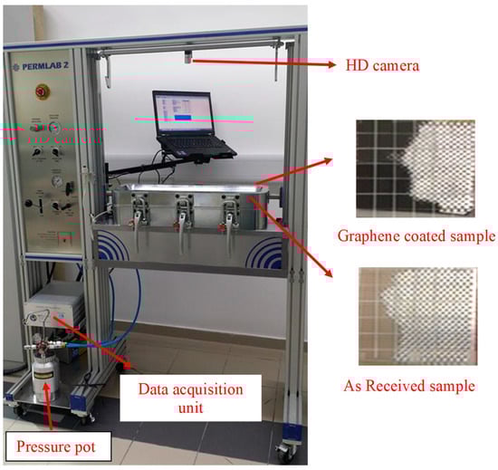 Permeability tests were done at each principal in-plane direction i.e., K11 and K22 by cutting the glass fabric in two principal directions. In-plane permeability tests were performed for samples having different wt % of graphene coatings. Four layers of 400 mm × 100 mm representing 3 mm cavity thickness of glass fabric samples were placed on the tool. A constant injection pressure of 1 bar was used to inject the test fluid inside the mold cavity and flow front positions were monitored throughout the mold filling period.