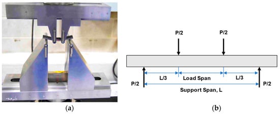 Four point flexural test specimens were prepared in accordance with ASTM D-6272. A third span loading configuration was used as shown in Figure 5. The tests were carried out on an MTS Insight 100 Material Testing Machine (Eden Prairie, MN, USA), with a laser extensometer to accurately measure the deflection. The test fixture had adjustable supports and loading bars that were 6.35 mm in diameter. The test specimens were carefully placed on the support bars to ensure that the loading was symmetric and that the sample was level. The loading rate was based on support span and specimen thickness in accordance with the ASTM standard. The coupons were 13 mm by 60.0 mm with an average thickness of 2.7 mm. The load span was taken as 1/3 of the support span and was according to 16:1 span-to-thickness ratio. The data was recorded at a sampling rate of 2.5 Hz. An average pre-load force of 20 N was applied to start consistently from the same load. The specimens were tested until failure. After testing, the data was analyzed and flexural modulus and strength were calculated. Following equations were used for calculating stress, strain and Young’s modulus,