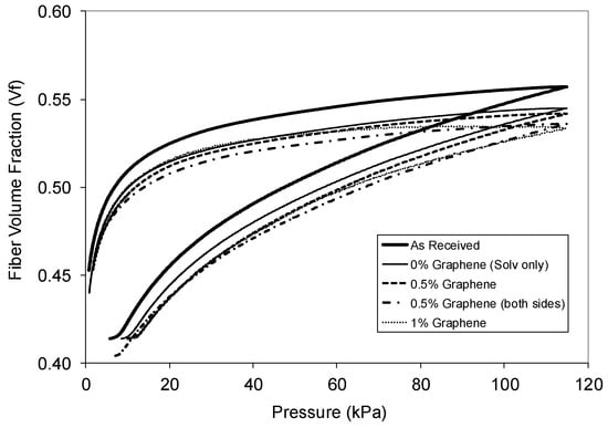 Figure 6 presents thickness change as a function of compaction pressure of the glass fiber reinforcements coated with different wt % of graphene. The figure presents both loading and unloading curves for all samples tested. The results were also compared with “As Received” glass reinforcement. The figure shows a clear trend of thickness variation at a set maximum pressure (corresponding to full vacuum condition). As graphene amount increases, the resistance to compaction of the glass reinforcement increases. It is suspected that the solvent affected the properties of the sizing present on glass fibers, causing it to become stiffer. In addition, the nanoparticles fill the voids between the glass tows and hence causing resistance to slipping of fibers under compaction loads. This implies that a glass fiber reinforcement coated with higher wt % of graphene will have higher resistance to compaction and hence the final product will be thick with low glass fiber volume content compared to a product manufactured using “As Received” glass reinforcements.