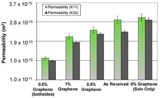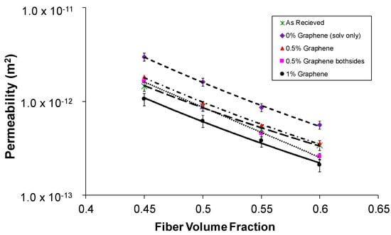 Permeability characterization tests were performed in three principal directions (K11, K22, and K33) directions. The transverse permeability (K33) test results for glass reinforcements coated with different wt % of graphene are presented in Figure 7. Three sets of tests were completed and the exponential equation was fit to the average data points. The transverse permeability values for glass fabric with graphene 0.5 wt % were very similar. The difference was found in the solvent treated samples and 1 wt % graphene coated samples, where the permeability was found to be higher and lower respectively. It is suspected that due to the use of solvent, the sizing on the glass fibers may have dissolved, as a result leaving behind channels for the fluid to flow through the thickness direction without much resistance. As oppose to samples coated with 1 wt % graphene, where excessive coating left open channels blocked for fluid to flow, resulting in lower permeability.