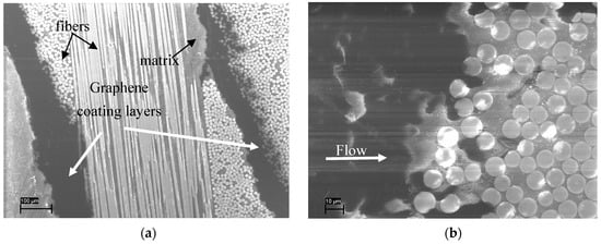 To measure the in-plane transient permeability (K11 and K22), the flow front positions for all graphene coated and “As Received” samples were continuously monitored and recorded using a video camera. The transient permeability was estimated using Darcy’s law [29]. Figure 8 presents in-plane permeability results based on flow front positions. The permeability decreases with increase in graphene content. This is mainly attributed to greater resistance offered by graphene inclusions blocking the channels for resin flow. Figure 9 shows optical microscopy images where the flow of graphene nanoparticles through the fiber bundles is evident. Figure 10 shows SEM micrographs of graphene coated glass composites at different magnifications. The resin flow path is shown out of the plane. The images show a good distribution of graphene nanoparticles in the composites structure. The circular cylinders are the glass fibers surrounded by irregular shaped grapheneplatelets. The nanoplatelets which are approximately 5 µm in diameter flow through the fiber bundles and tows of the reinforcement as the resin flow both in-plane and in transverse directions.