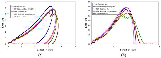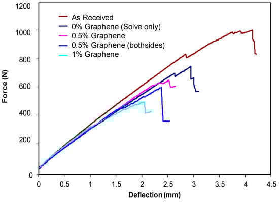 Load vs. deflection curves for different percentages of graphene coated glass fiber composites.
