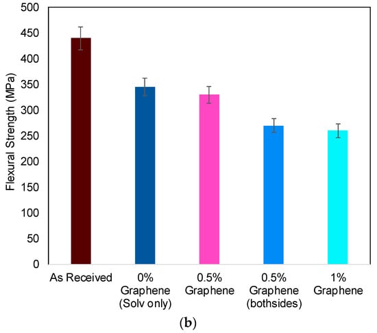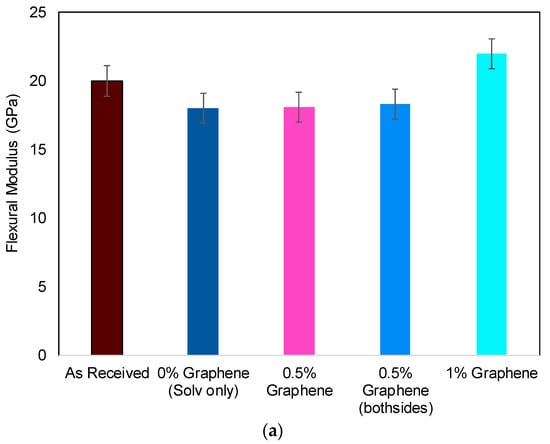 The plots in Figure 12a show the average flexural modulus and average flexural strength with error bars representing the range of the data for each set of experiments. The flexural modulus was highest with the 1% graphene amount while it remained almost constant for all other samples. The flexural strength decreased as the amount of graphene increased as shown in Figure 12b. The graphene used in this study was not functionalized, and it is anticipated that after treatment with resin compatible functional groups, the static and dynamic properties can be enhanced [12].