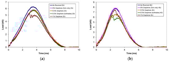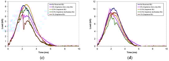 Load vs. time of glass fiber composites under impact (a) 20 J, (b) 40 J, (c) 60 J, and (d) 80 J.
