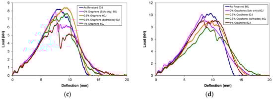 Load vs. deflection of glass fiber composites under impact (a) 20 J, (b) 40 J, (c) 60 J, and (d) 80 J.