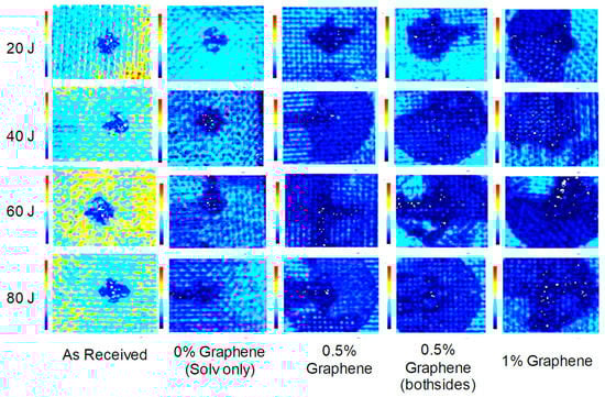In Figure 13 and Figure 14, the sudden drop in force between 2 ms and 4 ms represents damage or delamination, mostly occurring in graphene coated samples. The damage in the “As Received” and 0% graphene is more localized and can be seen in the C-scan in Figure 15. The damage area was not clearly visible through naked eye for the graphene coated samples. The C-scan images showed that the damage area was in-between the plies due to delamination and this phenomena increased as the graphene concentration increased. It can be inferred that the inclusion of graphene into the samples resisted the propagation of cracks and through thickness penetration.
