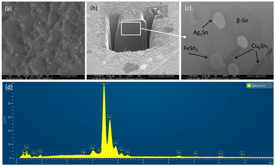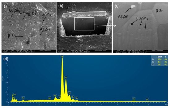 Sn–Ag–Cu solder alloy: (a) top-view SEM micrograph; (b) cross-section view SEM micrograph; (c) zoom-in view of the area marked in (b) and (d) energy dispersive X-ray (EDX) spectra at (a) with quantitative analysis as an insert.