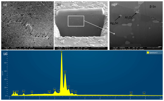 Sn–Ag–Cu solder alloy reinforced with Al2O3 nano-particles (SAC2): (a) top-view SEM micrograph; (b) cross-section view SEM micrograph; (c) zoom-in view of the area marked in (b) and (d) EDX spectra at (a).