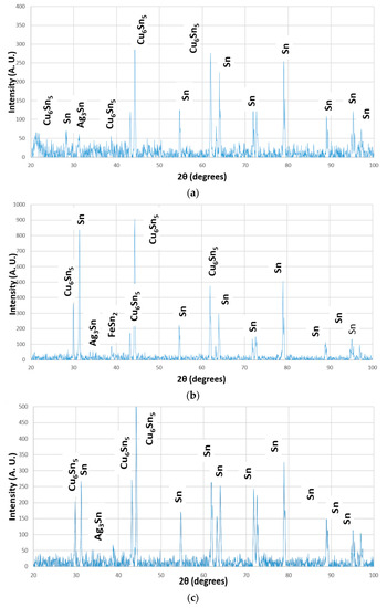 XRD spectra of solder alloys: (a) Sn–Ag–Cu alloy; (b) Sn–Ag–Cu alloy reinforced with Fe nanoparticles and (c) Sn–Ag–Cu alloy reinforced with Al2O3 nano-particles.