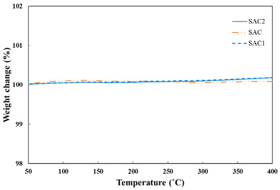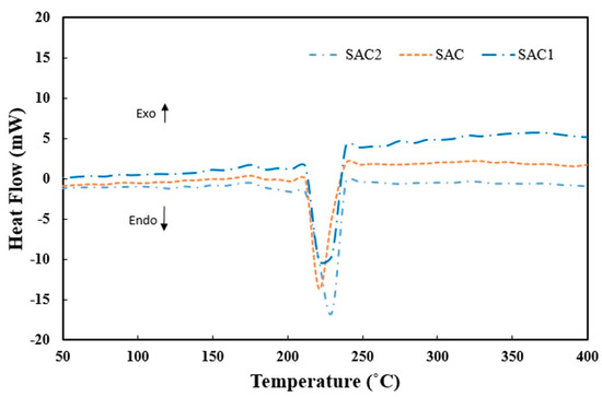 Thermal analysis of the samples was carried out in order to determine the effect of nanoparticles addition in monolithic SAC alloy as shown in Figure 5 and Figure 6. Figure 5 shows thermal gravimetric analysis (TGA) of solder alloys over temperature ranges from 50 °C to 400 °C. As evident, there was not any significantly change over the temperature range which suggest high thermal stability of these material up to 400 °C. Figure 6 shows the differential scanning calorimetry (DSC) of the alloys. Melting temperature of monolithic SAC solder alloy vary with the addition of different nanoparticles (Al2O3, C and Fe) as shown in Figure 6 from DSC analysis. However, this temperature difference took place over a very narrow range, i.e., between 220 °C and 230 °C. This confirms that the addition of nanoparticles in monolithic SAC solder alloy retain the melting temperature in desired range, which is suitable for their intended applications [25,26]. The area under DSC peaks represent energy density of solder alloys and it is 176.02, 175.5 and 178.01 J/g for SAC, SAC1 and SAC2 alloy, respectively. Thus, these materials have the potential to store thermal energy during their phase change from solid to liquid. As shown in Figure 6, melting temperatures are 220.9 °C and 220.8 °C for SAC1 and SAC2 as compared with 221.4 °C for SAC. Thus, with the addition of Fe or Al2O3, melting temperatures only changed slightly with respect to SAC alloy. Fe-bearing solders (SAC1) solidify at relatively lower temperatures than that of SAC during cooling as difficult nucleation of β-Sn can results in high degrees of undercooling prior to solidification. This indicates that β-Sn phase requires a large degree of undercooling to nucleate and solidify, explaining the existence of relatively larger primary β-Sn grains in SAC1 as reported in Section 3.1. The onset transformation temperature for exothermic descent of the curves, which represents the onset of melting, does not change markedly. It is understood that by adding Fe or Al2O3 in SAC, alloy composition has moved away from eutectic values, as shown by the effect of melting point peak broadening from DSC results (Figure 6) [25,26].